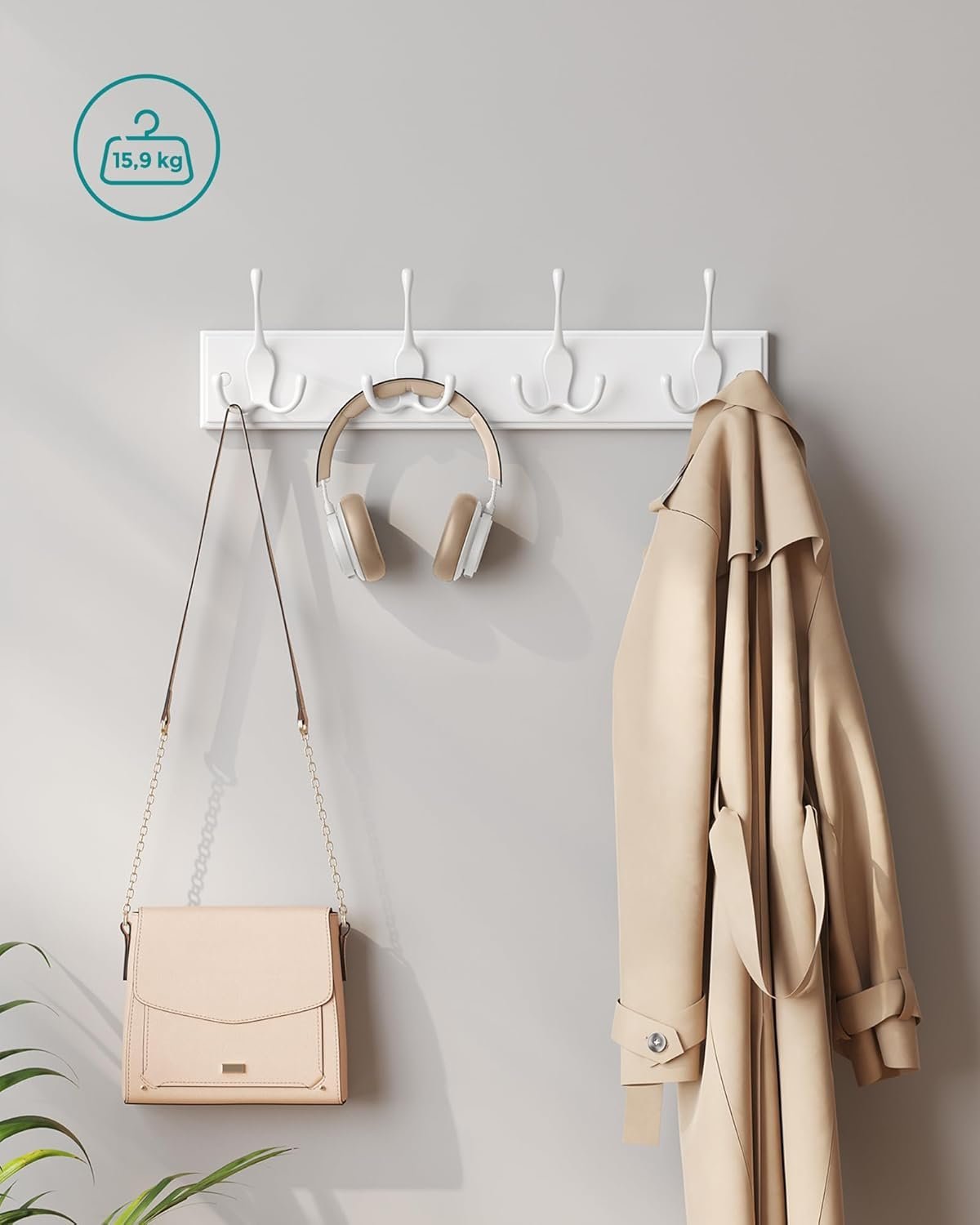 SONGMICS Cuier perete cu 4 carlige triple, MDF si aliaj zinc, 40×11 cm, alb