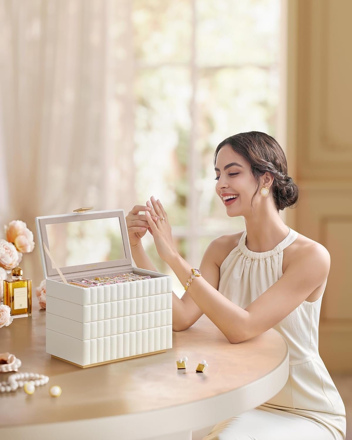 SONGMICS Cutie bijuterii 17x28x21 cm, 4 niveluri, oglinda, captuseala catifea, piele PU alba