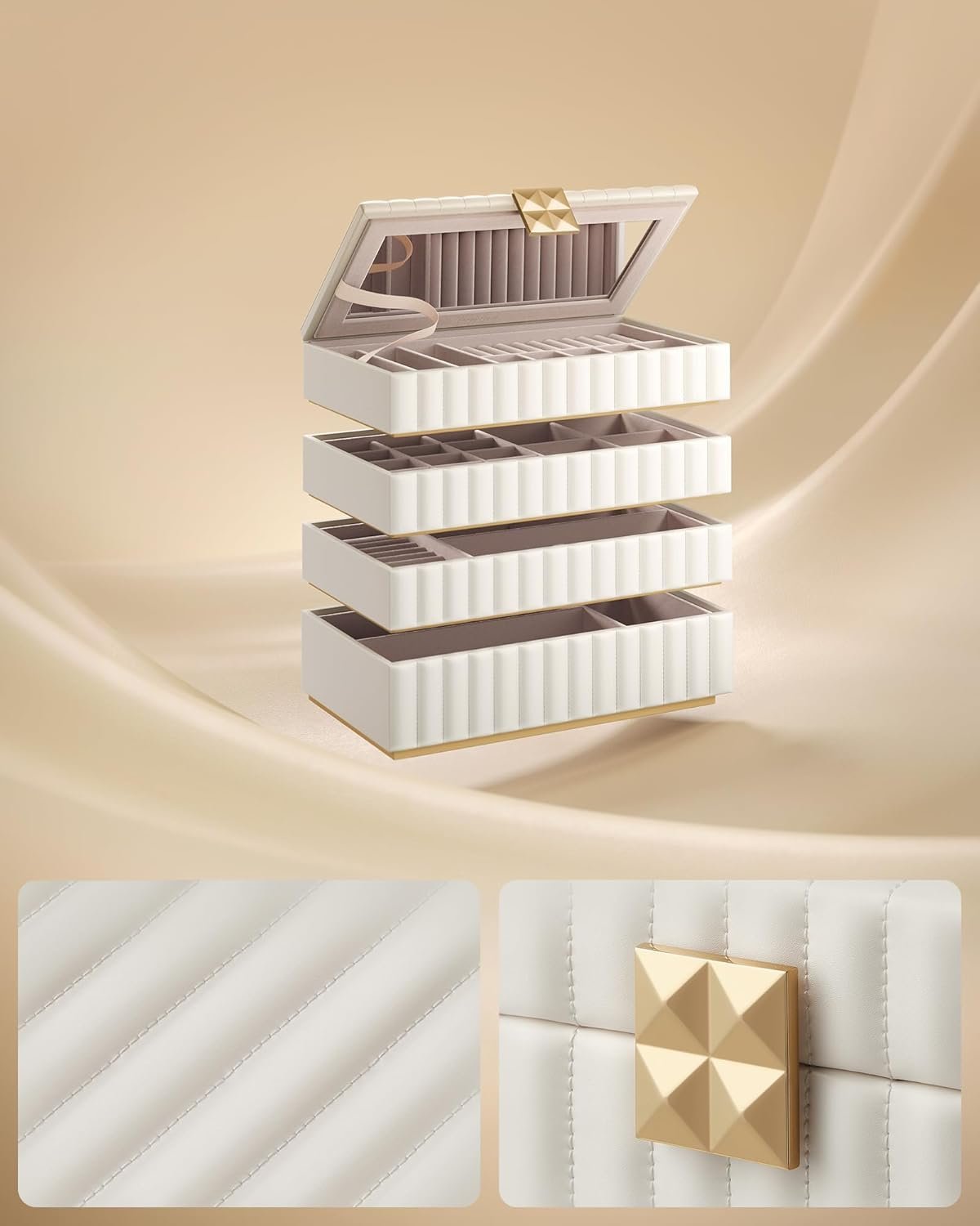 Specification: SONGMICS Cutie bijuterii 17x28x21 cm, 4 niveluri, oglinda, captuseala catifea, piele PU alba