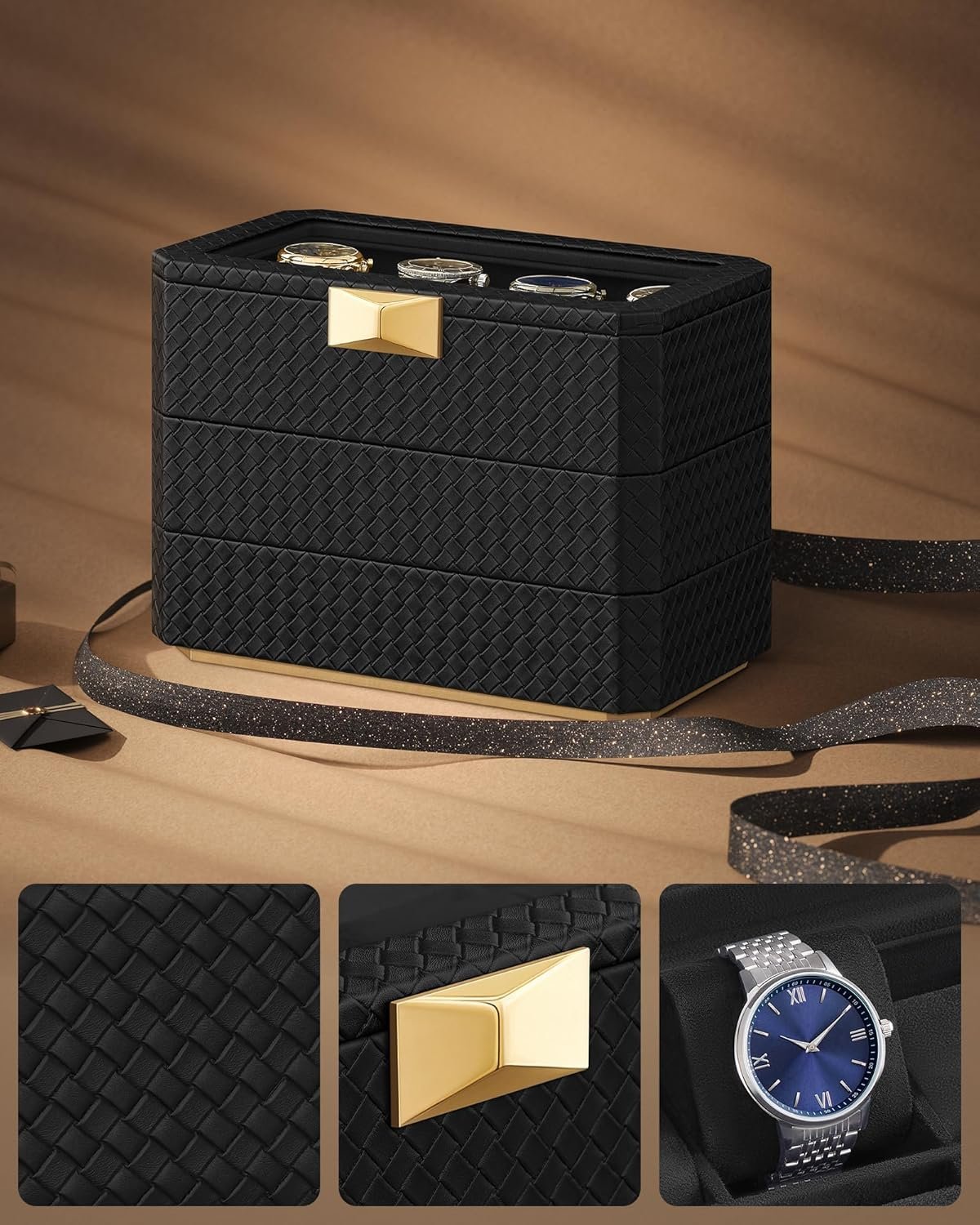 SONGMICS Cutie bijuterii si ceasuri Ronne, 3 niveluri, capac sticla, 27x20x16 cm, negru texturat