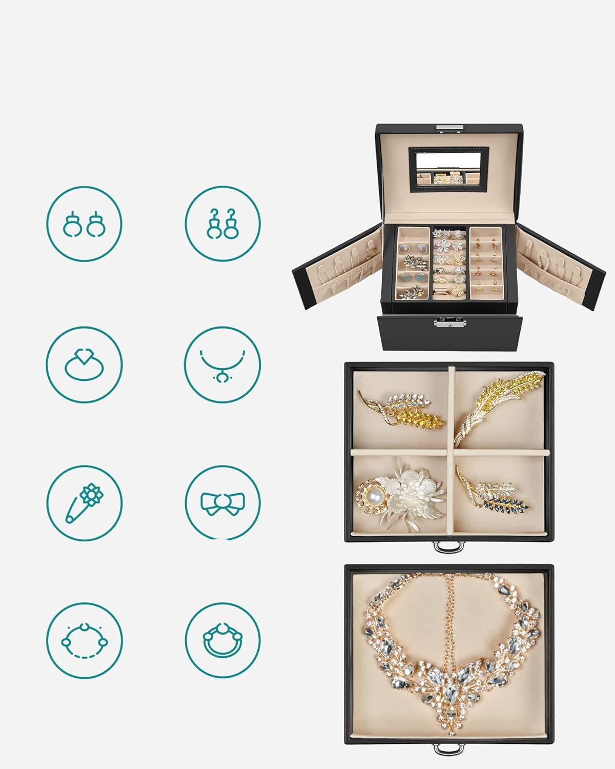 SONGMICS Cutie de bijuterii cu 3 nivele, 2 sertare, oglinda si incuietoare, 14x18x14cm, negru