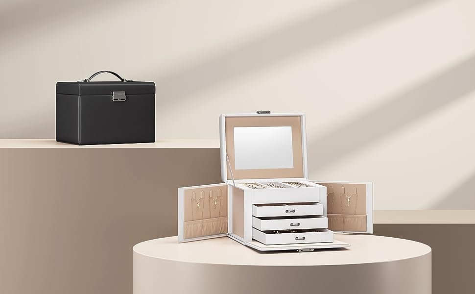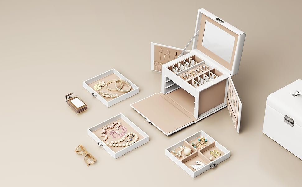 Specification: SONGMICS Cutie de bijuterii cu 4 nivele, 3 sertare, oglinda si incuietoare, 18x23x17cm, alb