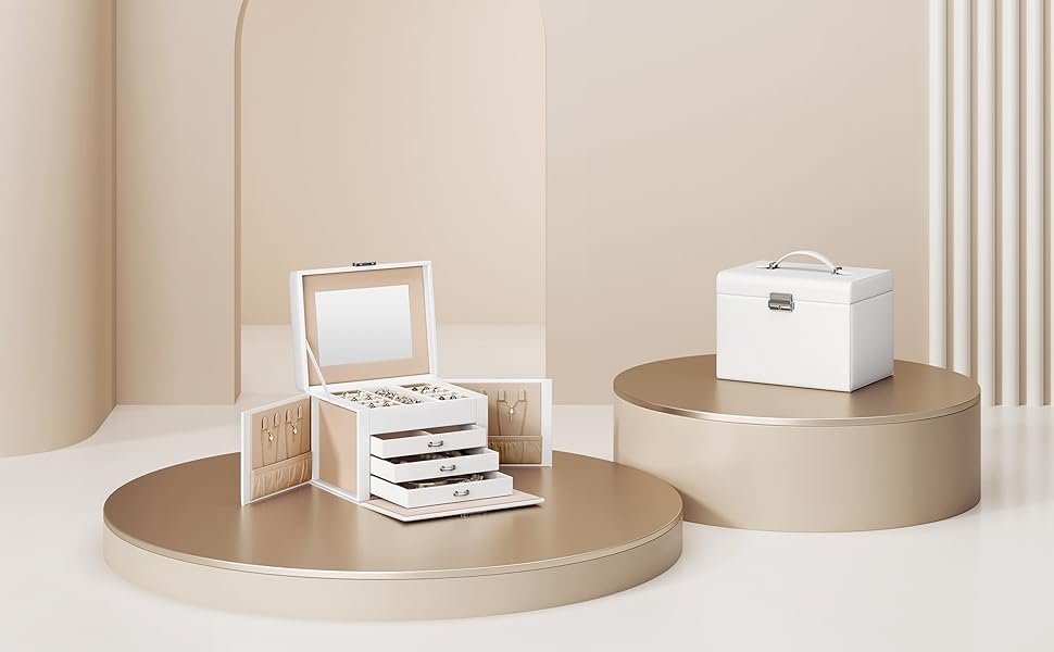 Specificatii: Culoare: alb Material: MDF (placi din fibre de densitate medie), exterior PU (poliuretan), captuseala din catifea Dimensiune produs: 17,5 x 22,5 x 16,5 cm (L x l x H) Greutate produs: 1,6 kg Continutul pachetului: 1 x Cutie de bijuterii 2 x cheie Pastrati-va diversele bijuterii organizate cu aceasta cutie spatioasa de bijuterii. Are mai multe carlige pentru colier pe ambele parti si 4 niveluri de depozitare cu o multime de compartimente diferite. Incuiat si portabil: Organizatorul de bijuterii se incuie cu 2 chei pentru a va pastra piesele pretuite departe de copiii obraznici; Datorita manerului din partea superioara, husa de bijuterii mica este portabila pentru utilizare in calatorii Cu oglinda interioara: Aceasta cutie de bijuterii are o oglinda transparenta pe capac pentru a va face mai convenabil sa va machiati, sa va puneti sau sa scoateti bijuterii si sa va verificati aspectul inainte de a iesi. Solid si durabil: Suprafata din piele sintetica de calitate, un corp robust din MDF si cusaturile ingrijite fac o cutie de bijuterii de calatorie robusta si durabila, care va va tine companie multi ani de acum inainte.