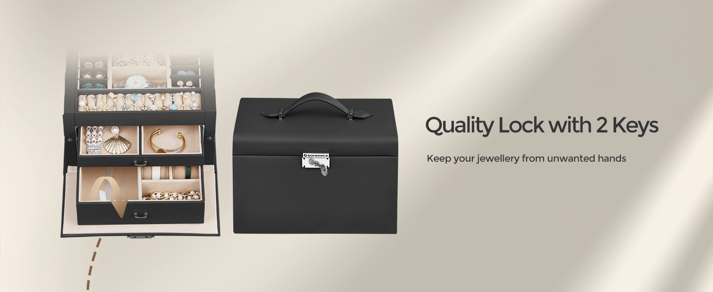 Specification: SONGMICS Cutie de bijuterii pe 3 nivele, cu 2 sertare, oglinda, maner, inchidere cu cheie, 18x26x17cm, negru