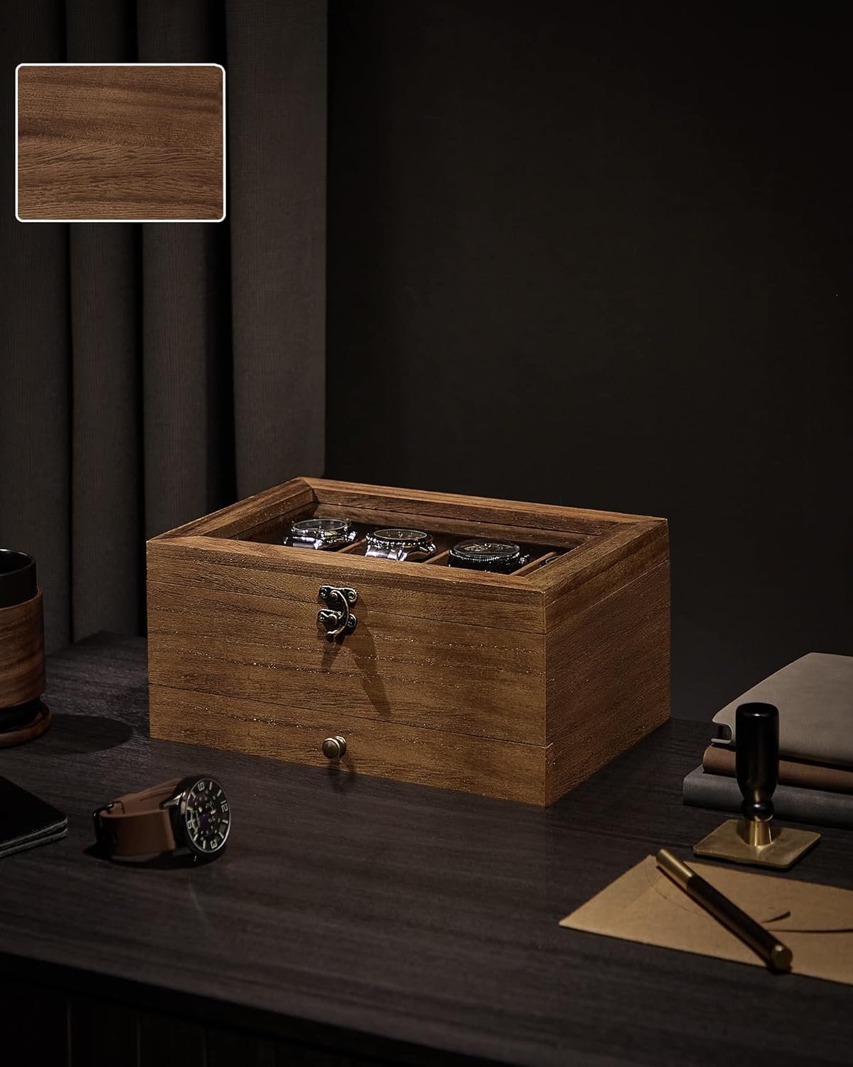 Culoare: maro rustic Material: Lemn Stil: rustic Dimensiunile produsului: 19D x 27W x 12.5H cm Despre acest articol Capacitate mare si depozitare divizata: Cu 8 sloturi pentru ceasuri pe primul strat si diverse compartimente in sertarul de jos pentru bratarile, inelele si butonii dvs. de ceas, aceasta cutie cu 2 niveluri va pastreaza atat ceasurile, cat si bijuteriile bine organizate.Clasic si rustic: Avand un cadru din lemn masiv cu granulatie bogata si un capac mare din sticla transparenta, acest suport pentru ceasuri nu numai ca va satisface nevoile de depozitare, dar va stilizeaza colectia de ceasuri si va infrumuseteaza spatiul.Materiale de calitate, protectie completa: Realizat cu un cadru din lemn solid la exterior si catifea moale la interior, aceasta cutie pentru ceasuri ofera protectie completa pentru ceasurile dvs. (impotriva accidentelor si zgarieturilor).Eleganta si practica, aceasta cutie de depozitare a ceasurilor este o idee de cadou grozava pentru zile de nastere, aniversari sau sarbatori, fie ca este vorba de familie, de prieteni sau de cineva special.