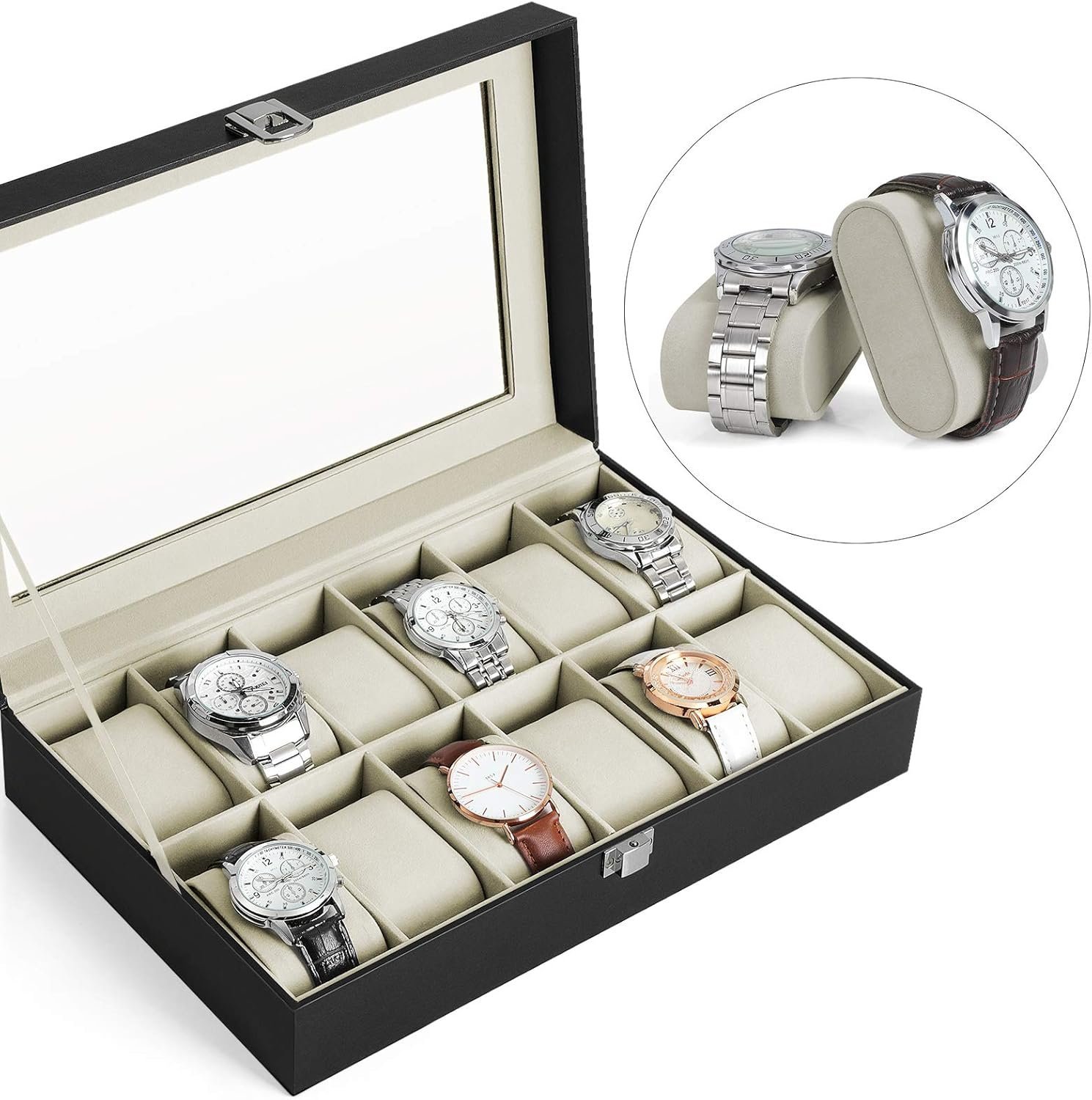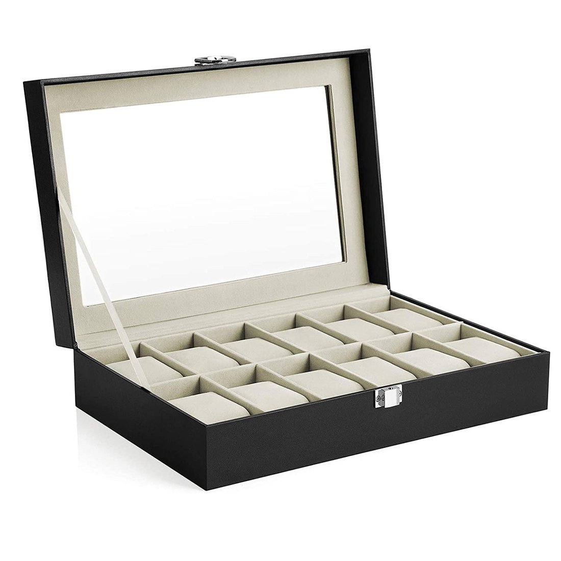 SONGMICS Cutie depozitare ceasuri cu 12 compartimente, capac din sticla, interior catifea, 30x21x9 cm, negru