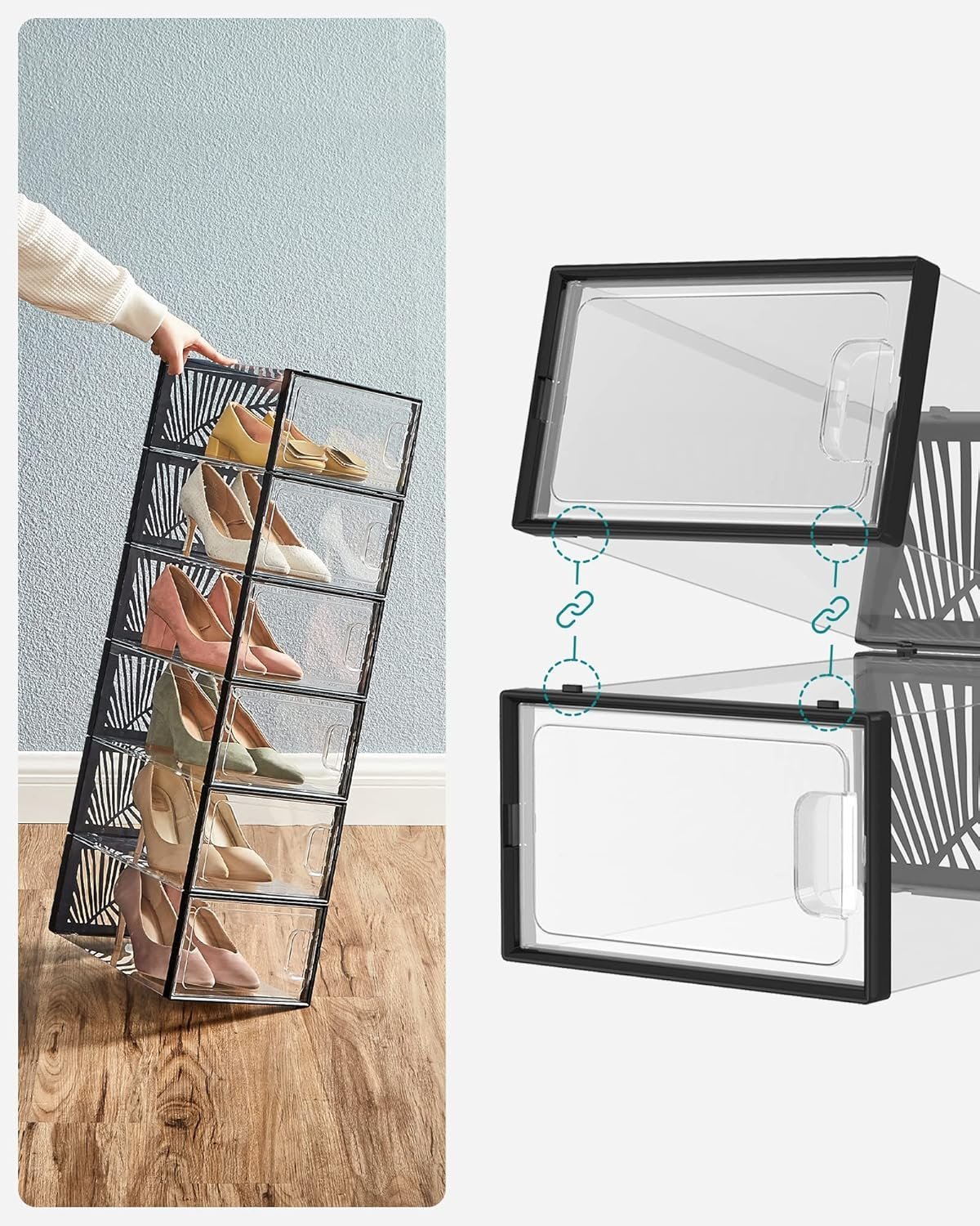 SONGMICS Cutii de pantofi, set 18 organizatoare stivuibile, structura rezistenta ABS, 34x23x14 cm, transparent si negru