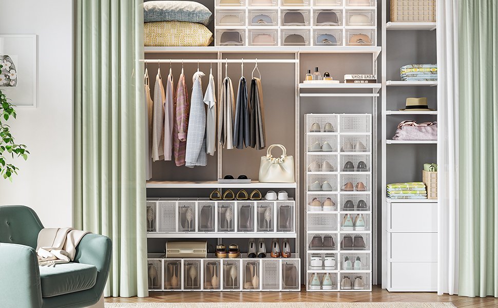 Specificatii: Culoare: Transparent, alb Material: Corp din plastic PP (polipropilena), usa frontala PP (polipropilena), cadru din plastic ABS Dimensiunea cutiei unice: 33,5 x 23.2 x 14.3 cm (L x l x a) Dimensiunea interioara a cutiei simple: 31.2 x 22,5 x 22,5 x 13,5 cm (L x l x i) Greutatea produsului: 5,3 kg Despre acest articol Acest set de 18 cutii modulare pentru depozitarea pantofilor este o solutie practica si eficienta pentru a organiza si depozita pantofii intr-un mod ordonat si protejat. Aceste cutii modulare sunt concepute special pentru a oferi o solutie de depozitare pentru pantofii tai.Daca vrei sa depozitezi cutiile intr-un mod organizat, design-ul corespunzator face stivuirea lor o joaca de copii; orificiile de ventilatie permit pantofilor tai sa respire.Asamblare rapida: Pur si simplu imbinati partea frontala, spatele si corpul impreuna si vei avea aceste cutii pentru pantofi cu dimensiuni interioare de 31.2 x 22,5 x 22,5 x 13,5 cm; fiecare pereche de adidasi, pantofi cu toc sau balerini va avea un loc al sau.Pachet de 18 cutii de pantofi transparente cu usa frontala transparenta, design stivuibil si pliabil, gauri de ventilatie. Spuneti la revedere de la pantofii imprastiati peste tot si puneti-va in ordine pantofii acum!