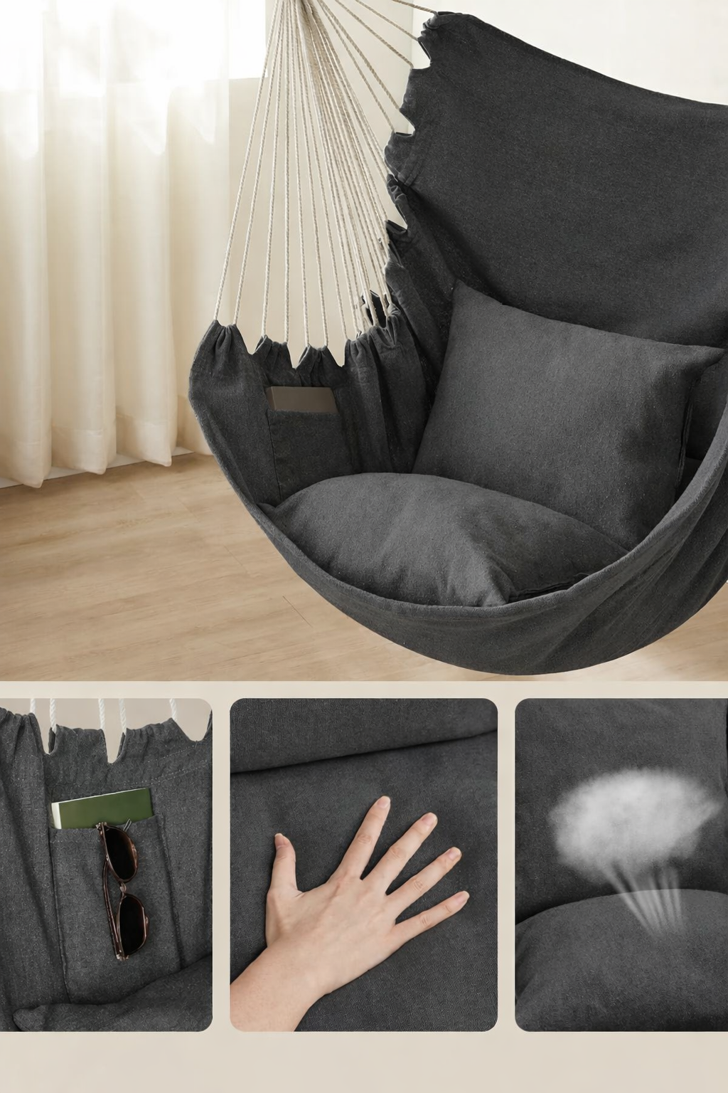 SONGMICS Fotoliu suspendat tip hamac cu 2 perne, lant si carabiniera incluse, 150×128 cm, gri inchis