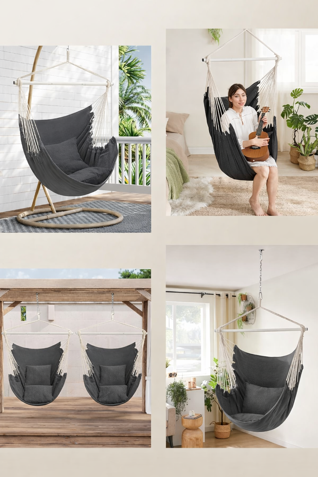 Be the first to review “SONGMICS Fotoliu suspendat tip hamac cu 2 perne, lant si carabiniera incluse, 150×128 cm, gri inchis”