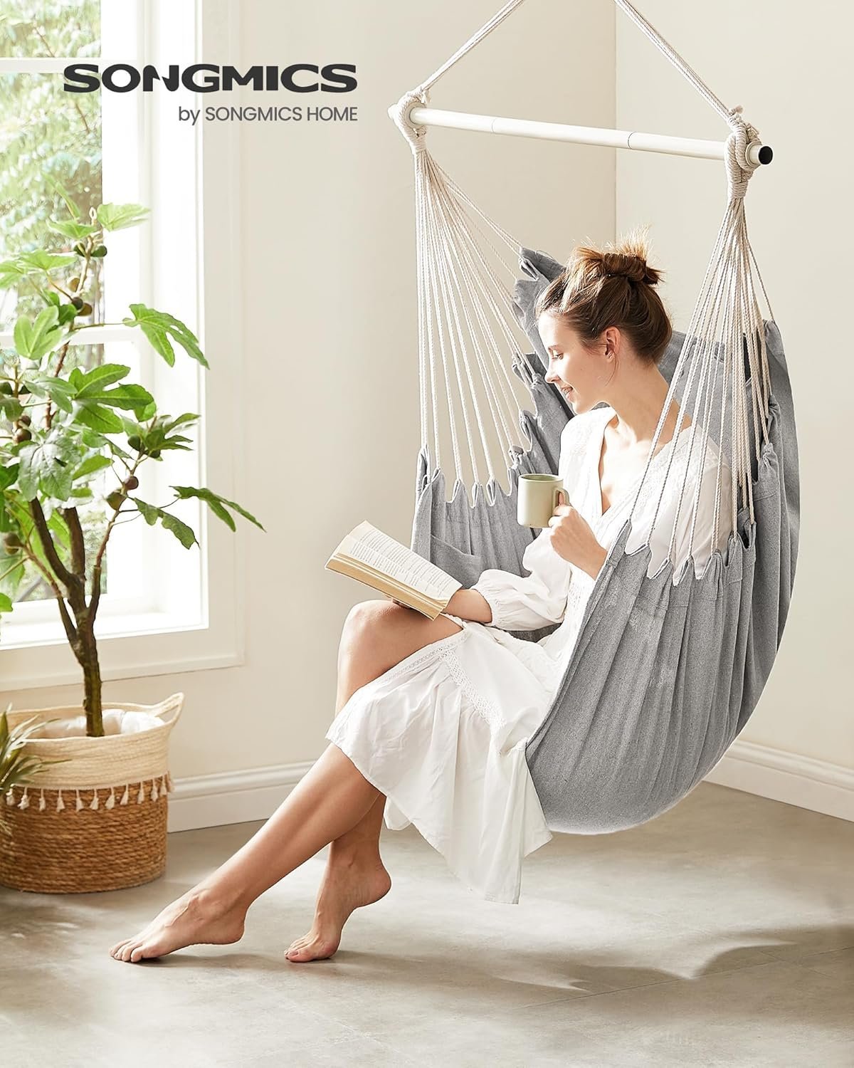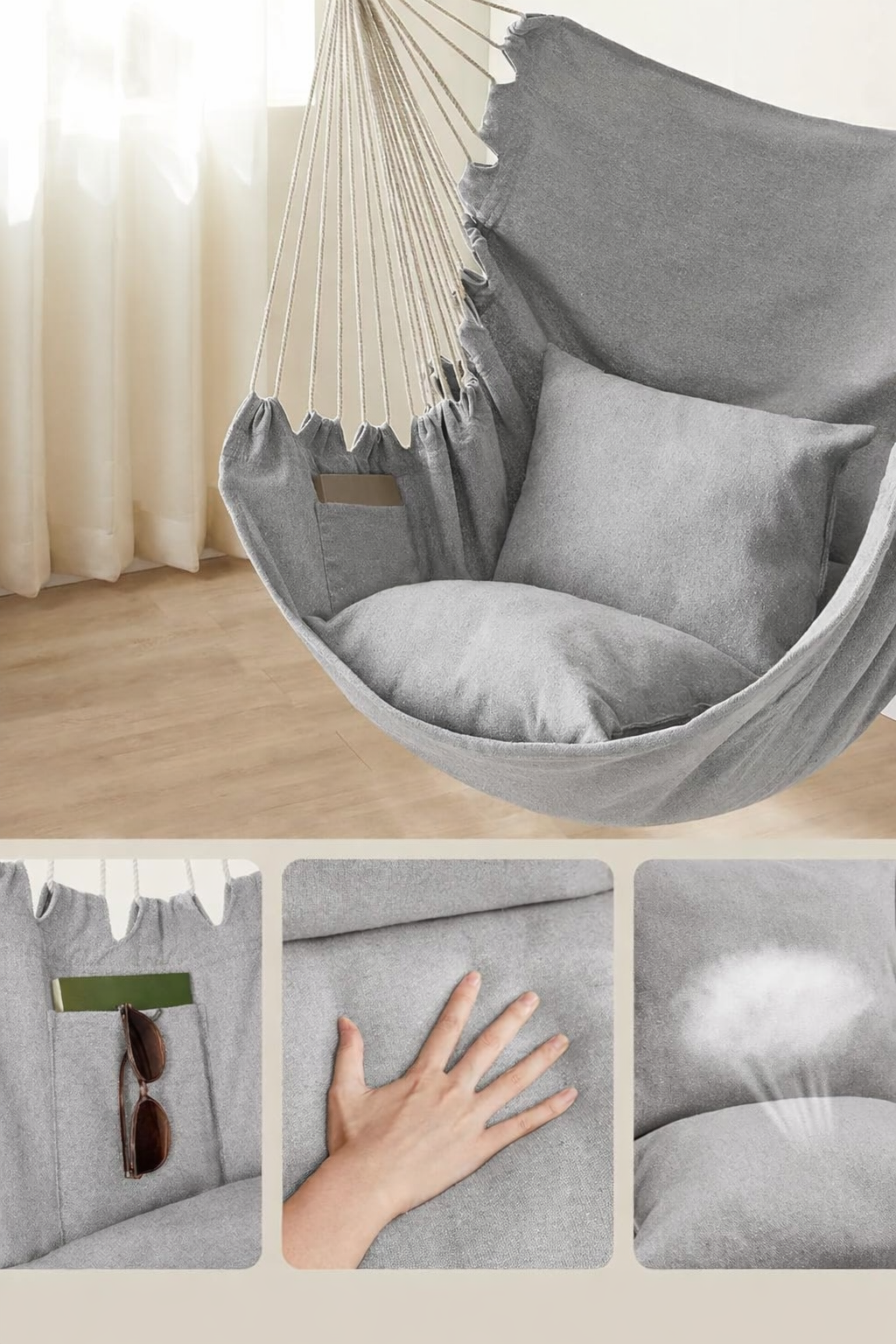 Specification: SONGMICS Fotoliu suspendat tip hamac cu 2 perne, lant si carabiniera incluse, 150×128 cm, gri