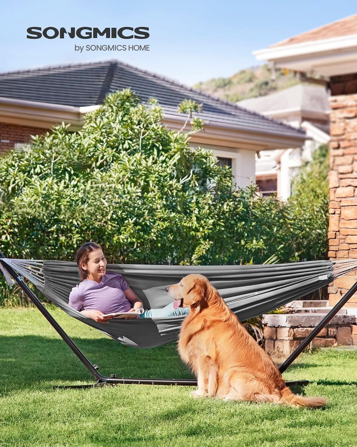 SONGMICS Hamac cu cadru metalic, reglabil la 5 inaltimi, maxim 240 kg, 300x90x95cm, gri