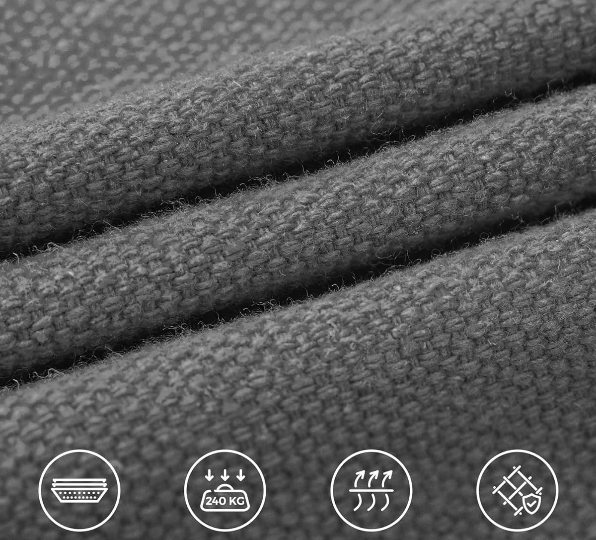 Detalii despre produs: Culoare: Cadru negru, hamac gri Material: Metal, bumbac, poliester Dimensiunea cadrului: 300 x 90 x 95 cm (L x l x i) Dimensiunea hamacului: 210 x 150 cm (L x l) Max. Capacitate de incarcare statica: 240 kg Despre acest articol Siguranta si stabilitate: Suportul triunghiular tridimensional este format din picioare de extensie pe ambele parti in partea de jos si o bara laterala, care asigura mai multa stabilitate. Capacitatea maxima de incarcare este de 240 kg – suficient spatiu pentru a va relaxa!Respirabil si confortabil: Hamacul este fabricat din tesatura rezistenta la rupere de 380 g/m², care este durabila, respirabila si confortabila si va infasoara corpul in mod stabil, astfel incat sa va puteti relaxa in el.Usor de asamblat: Datorita constructiei simple, leaganul suspendat poate fi montat in cateva minute, fara unelte.Exista 5 gauri pe fiecare parte a barei de sustinere, astfel incat puteti regla inaltimea hamacului dupa cum doriti. Puteti folosi acest hamac cu suport in propria gradina sau il puteti da jos si il puteti lua singur pentru camping.