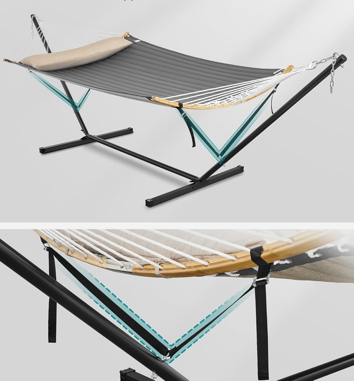 Specification: SONGMICS Hamac cu suport metalic, cu suprafata captusita, reglabil, include perna, 200 kg, 300x120x110 cm, gri