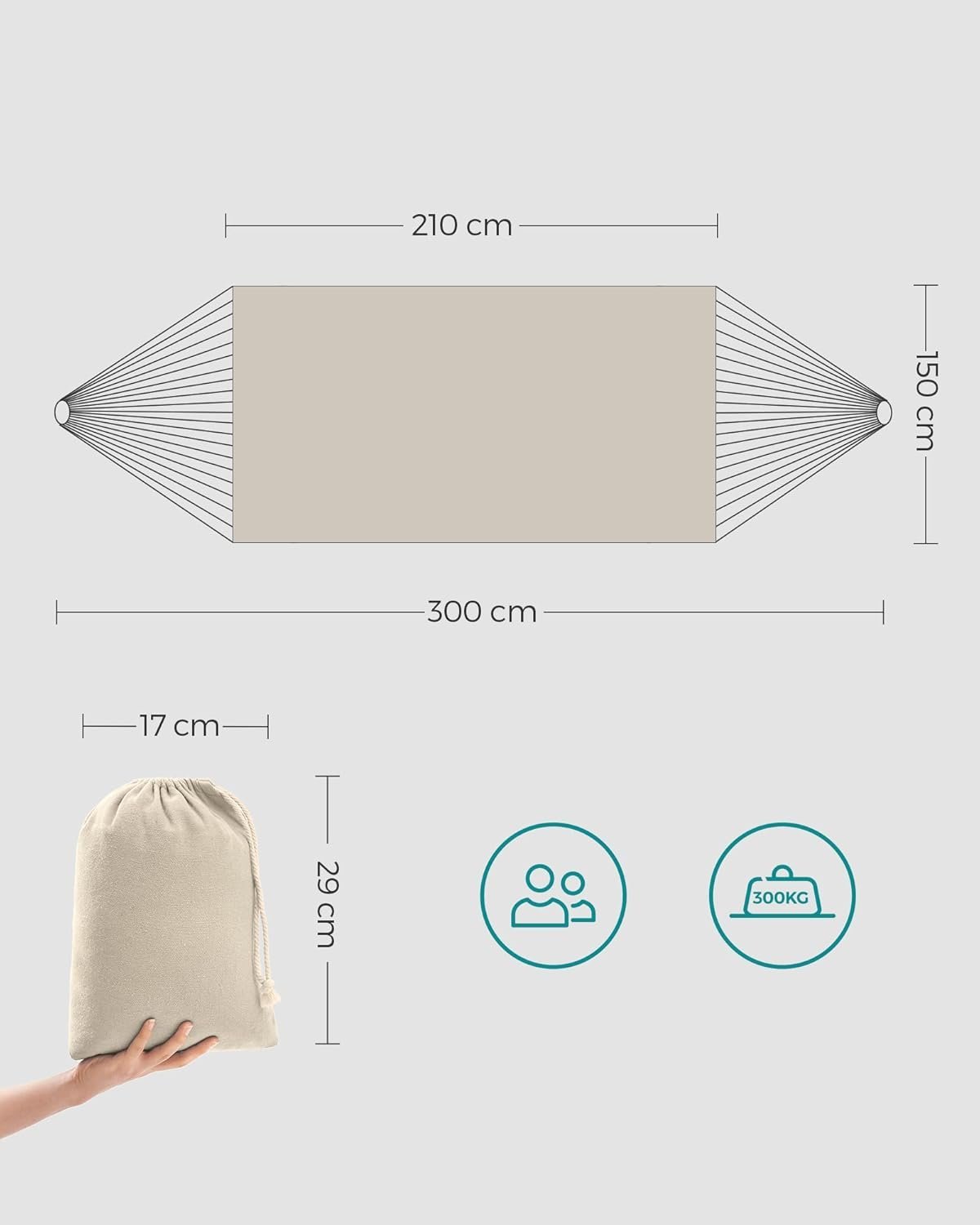 Specification: SONGMICS Hamac dublu 210×150 cm, bumbac, portabil cu chingi si carabiniere, bej