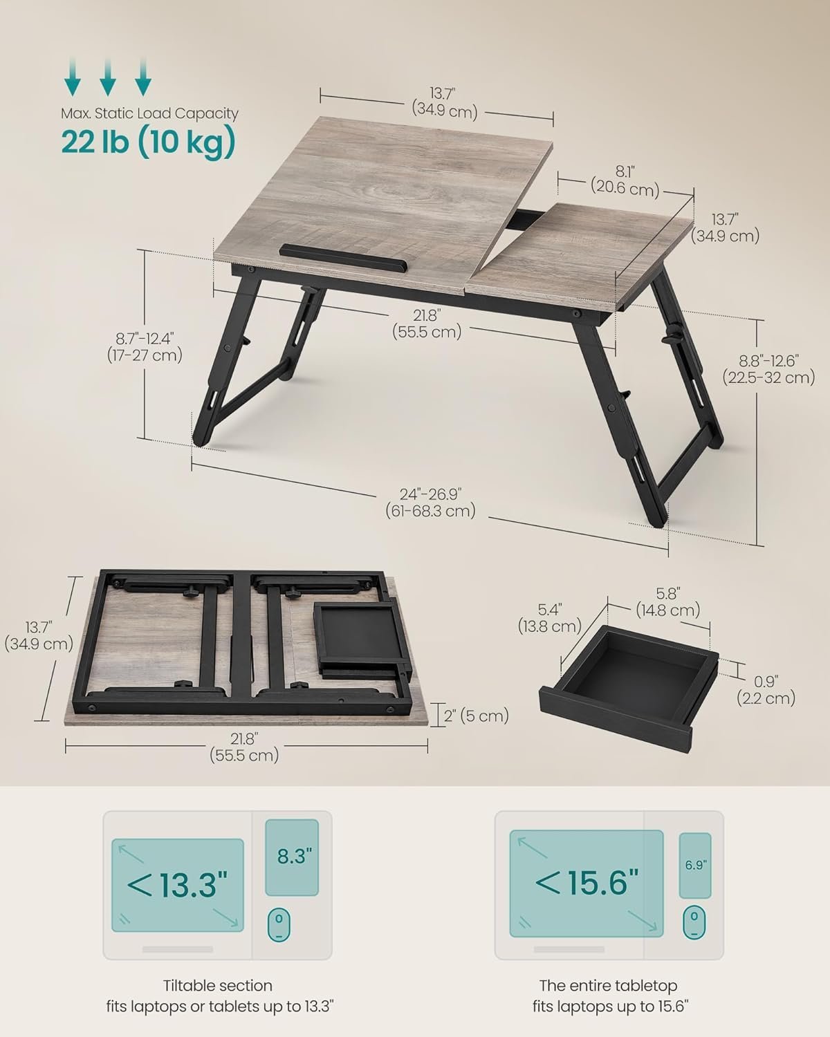 Specification: SONGMICS Masa laptop sau mic dejun cu picioare pliabile, din bambus, blat reglabil pe unghi si inaltime, 68x35x32 cm