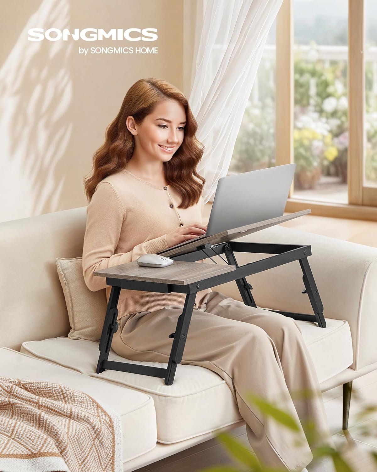 SONGMICS Masa laptop sau mic dejun cu picioare pliabile, din bambus, blat reglabil pe unghi si inaltime, 68x35x32 cm