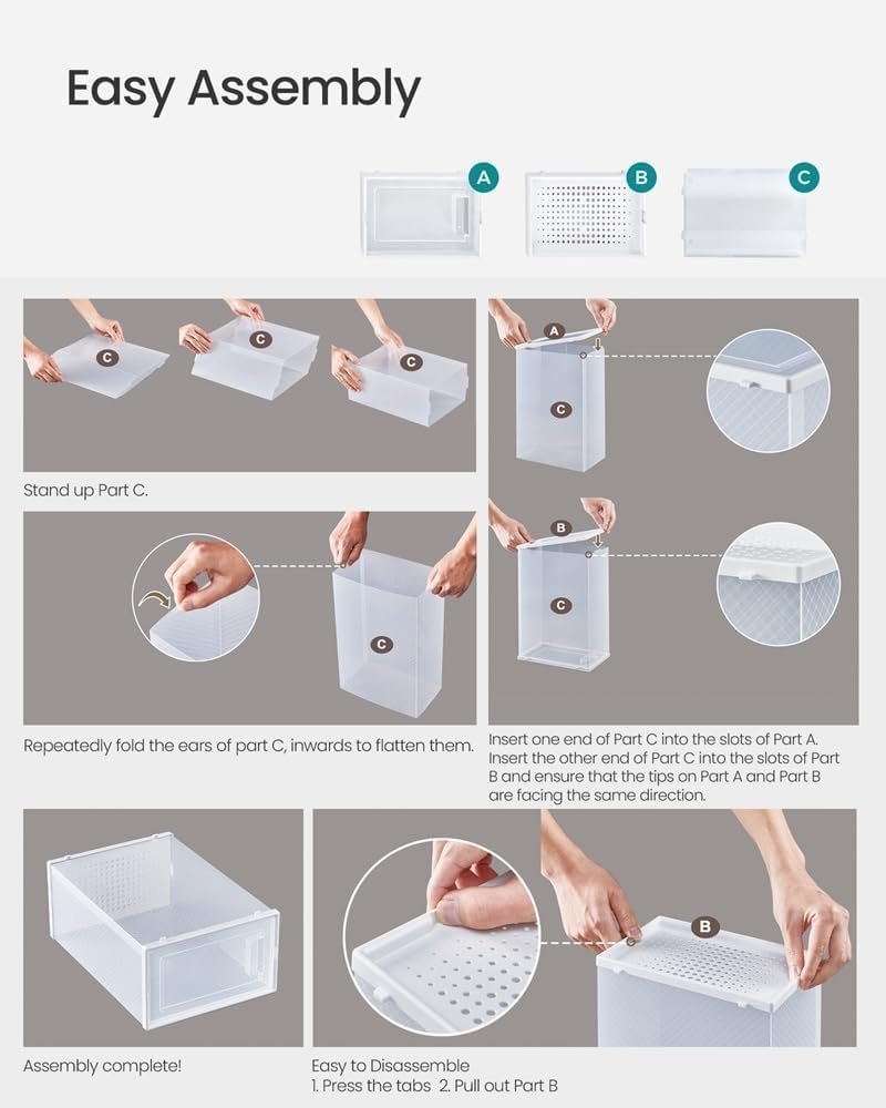 Specificatii tehnice: Brand: SONGMICS Tip produs: Cutii depozitare pantofi Numar bucati: 8 Dimensiuni: 33.5 x 23.2 x 14.3 cm Dimensiune interioara: 31.2 x 22.5 x 13.5 cm Material: Plastic PP (corp), PS (usa frontala) Culoare: Alb transparent Scurta descriere: Setul SONGMICS cu 8 cutii pentru pantofi este solutia ideala pentru organizarea eficienta a incaltamintei. Designul transparent permite vizualizarea rapida a continutului, iar structura stivuibila ajuta la economisirea spatiului. Perfect pentru orice dressing sau hol ordonat. Caracteristici principale: Set de 8 cutii pentru organizarea pantofilor Design transparent pentru identificare rapida Usa frontala pentru acces usor Structura stivuibila pentru economisirea spatiului Ventilatie integrata pentru aerisirea incaltamintei Montaj rapid si usor fara unelte Potrivite pentru adidasi, pantofi sau sandale Design pliabil pentru depozitare compacta
