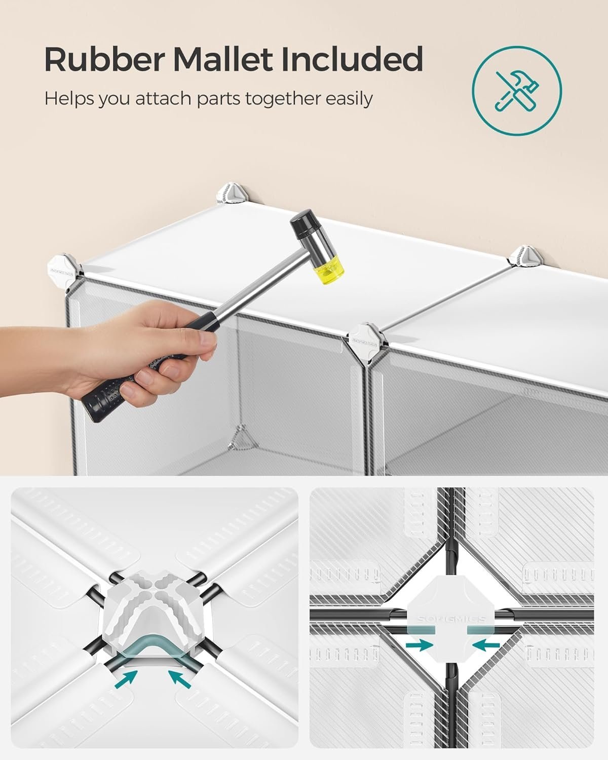 Specificatii tehnice Tip produs: Dulap pantofi modular Material: Plastic PP, conectori ABS, metal Cadru: Otel Culoare: Alb/transparent Numar compartimente: 12 Dimensiuni compartiment: 30x40x30 cm Dimensiuni totale: 124x32x125 cm Capacitate maxima pe compartiment: 5 kg Capacitate maxima totala: 60 kg Scurta descriere Dulapul de pantofi SONGMICS cu 12 compartimente ofera o solutie practica pentru organizarea incaltamintei si a accesoriilor. Structura modulara permite configurarea flexibila, iar usile transparente protejeaza continutul de praf, asigurand in acelasi timp ventilarea. Este potrivit pentru hol, dormitor sau zona de intrare. Caracteristici principale Configuratie modulara cu 12 compartimente spatioase Usi transparente pentru protectie impotriva prafului Structura stabila cu cadru metalic si panouri din plastic Ventilatie integrata pentru prevenirea mirosurilor Posibilitate de configurare in mai multe forme Accesorii incluse pentru montaj si stabilitate sporita