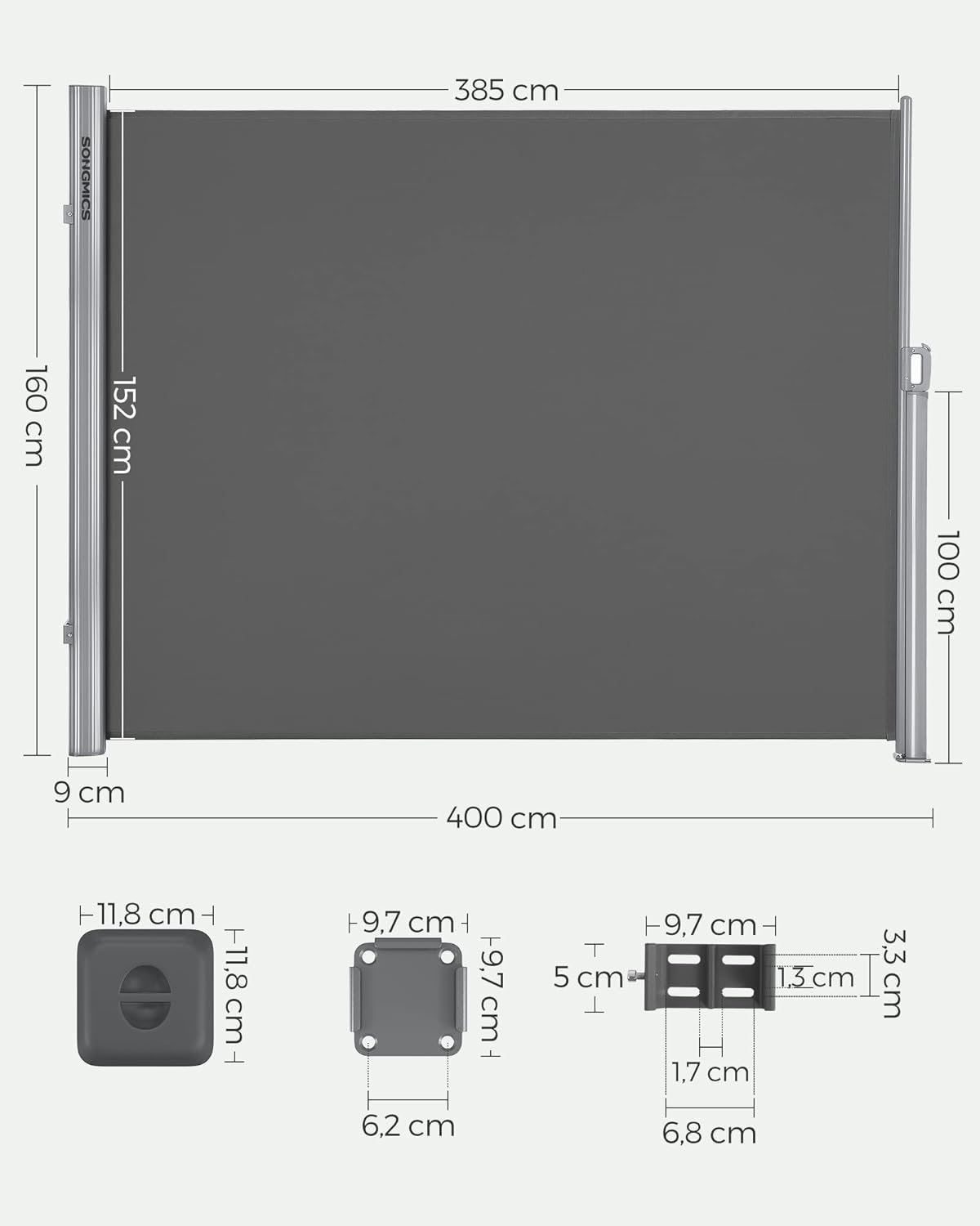 Detalii despre produs: Culoare: Antracit Material: Aliaj de aluminiu, poliester (280 g/m²), strat PU Dimensiuni: 160 x 400 cm (H x L) Greutatea produsului: 9,7 kg Tesatura de copertina din poliester acoperit cu PU de 280 g/m² este rezistenta la stropire si la soare, fiind perfecta pentru protejarea intimitatii si blocarea soarelui datorita UPF 50+. De asemenea, este rezistenta la decolorarea culorilor.Caseta acestui marchizon lateral si stalpul de sustinere sunt fabricate din aliaj de aluminiu de inalta calitate, in timp ce suruburile sunt fabricate din aliaj de zinc-nichel rezistent la rugina si de lunga durata.Datorita instructiunilor clare si a accesoriilor de asamblare incluse, puteti asambla aceasta marchiza in cel mai scurt timp. In plus, o baza de podea cu capac ofera o alta optiune de montare pentru o utilizare mai convenabila.Aceasta marchiza retractabila are un arc de inalta calitate si poate fi intinsa cu usurinta fara niciun zgomot deranjant in timpul utilizarii.Un cort lateral de 160 x 400 cm de la SONGMICS care poate fi folosit pentru a va umbri balconul sau terasa, plus o incuietoare de siguranta pentru copii pe maner care face ca acest cort de exterior sa fie si mai fiabil.