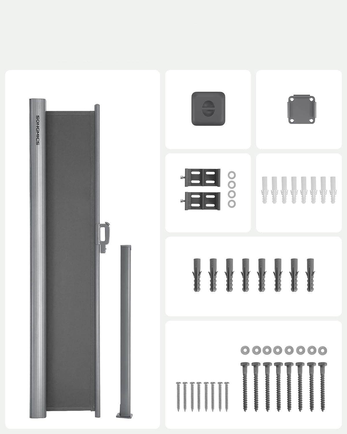 Specificatii: Culoare: gri fumuriu Material: Metal acoperit cu pulbere (cutie de copertina/ stalpi laterali), aluminiu (axul panzei), 220 g/m² poliester acoperit cu PVC (panza de copertina). Dimensiuni: 160 x 450 cm (H x L). Greutate: 8,7 kg. Tesatura de copertina din poliester acoperit cu PVC de 220 g/m² este rezistenta la stropire si la soare, fiind perfecta pentru protejarea intimitatii si blocarea soarelui datorita. De asemenea, este rezistenta la decolorarea culorilor.Caseta acestui marchizon lateral si stalpul de sustinere sunt fabricate din aliaj de aluminiu de inalta calitate, in timp ce suruburile sunt fabricate din aliaj de zinc-nichel rezistent la rugina si de lunga durata.Datorita instructiunilor clare si a accesoriilor de asamblare incluse, puteti asambla aceasta marchiza in cel mai scurt timp. In plus, o baza de podea cu capac ofera o alta optiune de montare pentru o utilizare mai convenabila.Aceasta marchiza retractabila are un arc de inalta calitate si poate fi intinsa cu usurinta fara niciun zgomot deranjant in timpul utilizarii.Un cort lateral de 160 x 450 cm de la SONGMICS care poate fi folosit pentru a va umbri balconul sau terasa, plus o incuietoare de siguranta pentru copii pe maner care face ca acest cort de exterior sa fie si mai fiabil.