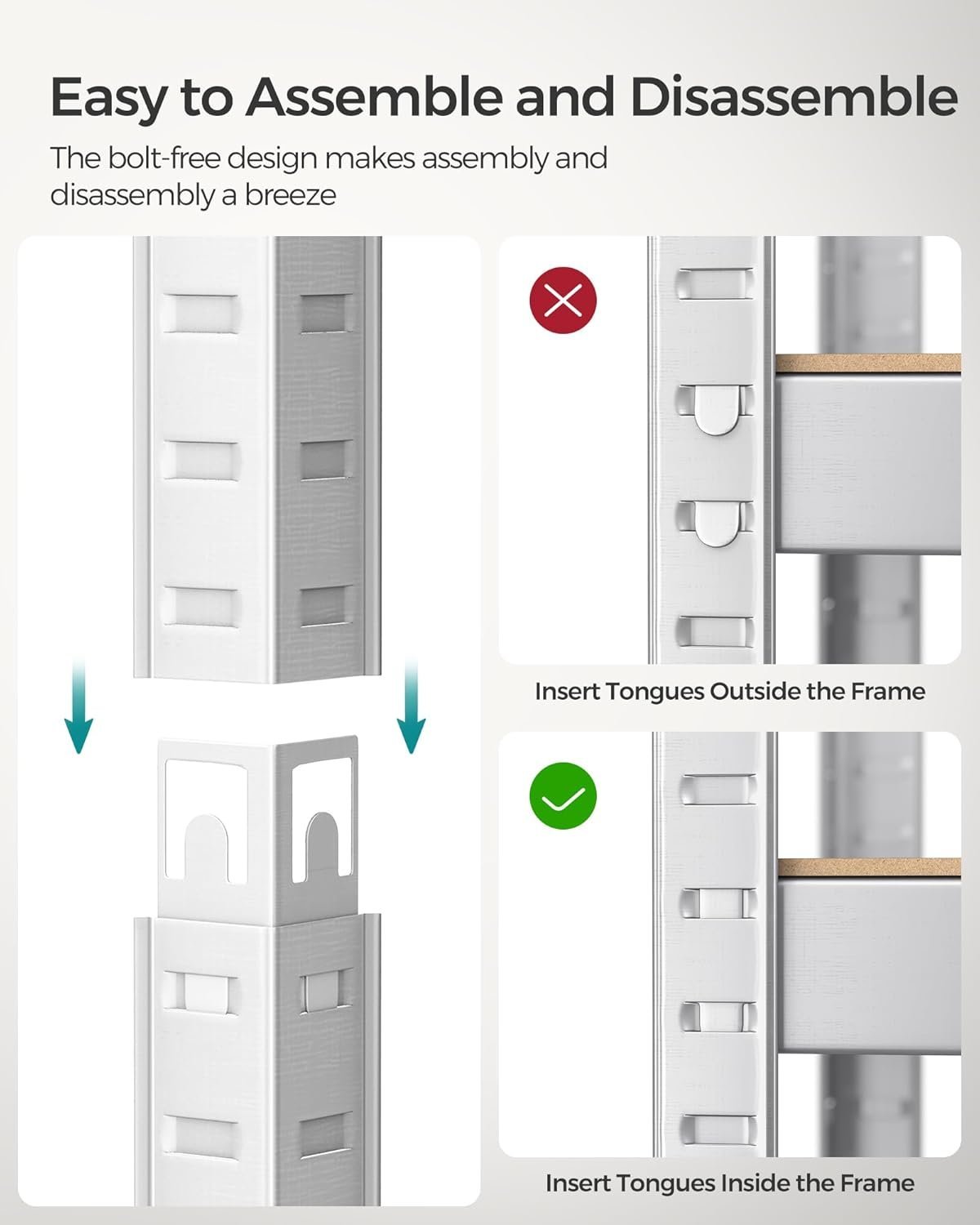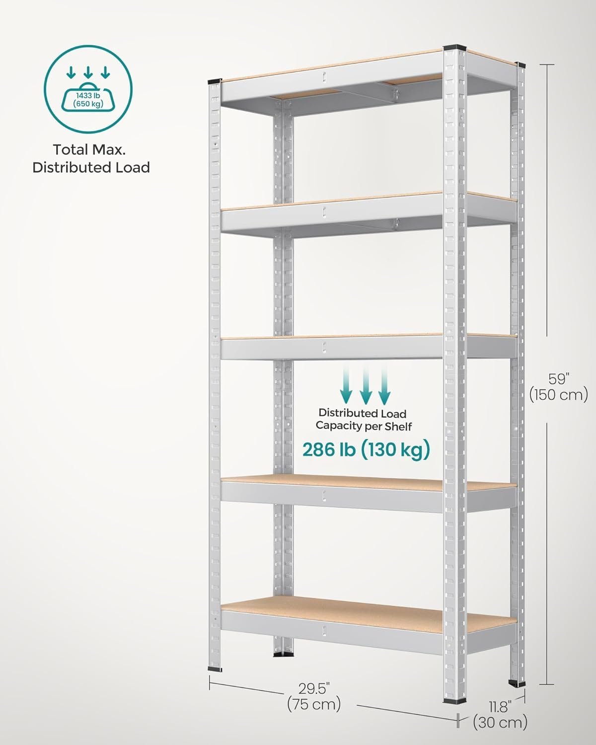 Specification: SONGMICS Raft cadru metalic modular pentru depozitare, 5 polite, 150x75x30cm, sarcina 650 kg, argintiu