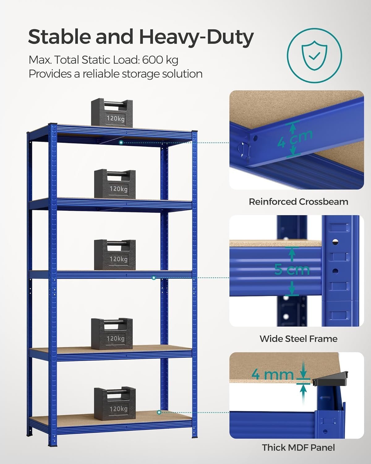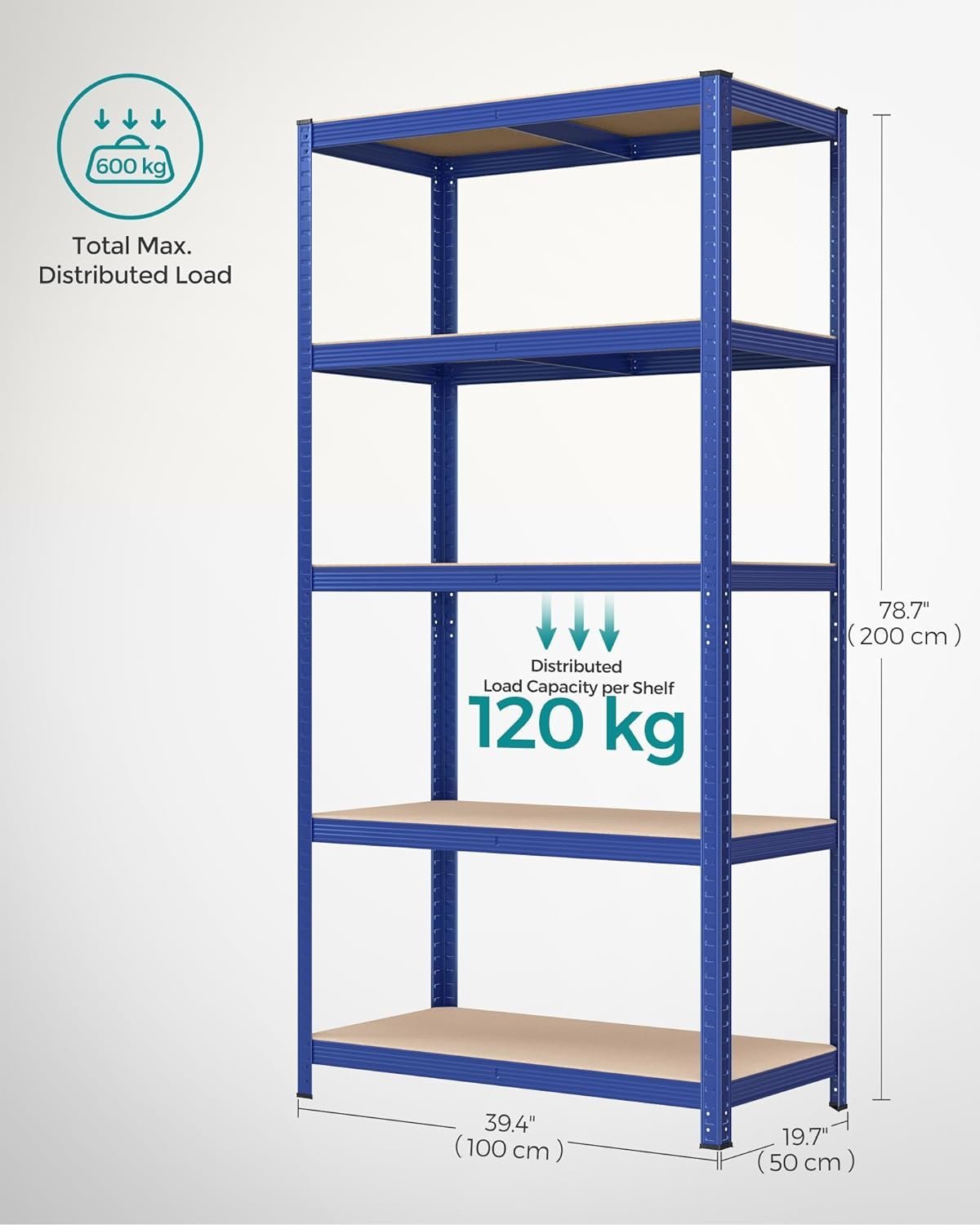 Specification: SONGMICS Raft de depozitare metalic, cu rafturi din PAL, 5 polite, max. 600 kg, 200x100x50cm, albastru