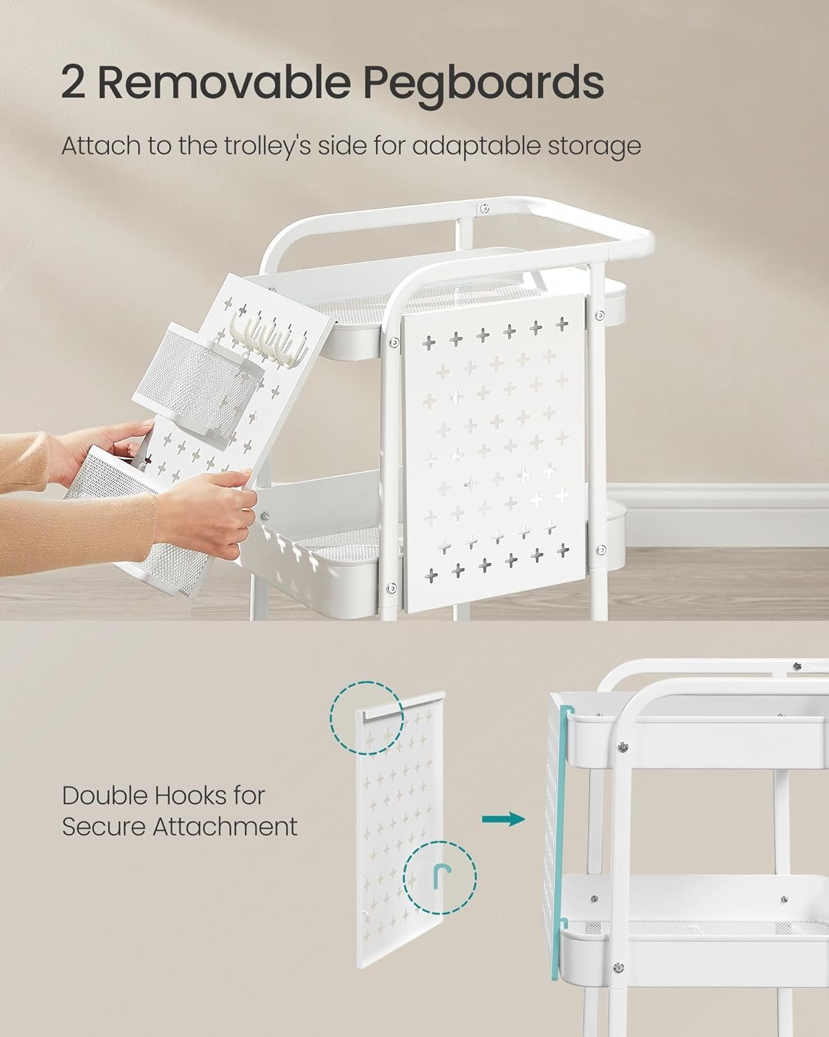 Specificatii: Culoare: Alb Material: Otel Dimensiunea produsului: 32.3 x 43.3 x 73.9 cm Max. Capacitate de incarcare statica pe nivel: 10 kg Max. Capacitate de incarcare statica totala: 30 kg Note: Va rugam sa nu depasiti capacitatea de greutate de 30 kg. Aveti grija cand va deplasati pe suprafete neuniforme pentru a evita rasturnarea. Asamblati produsul urmand instructiunile, evitand dezasamblarea violenta. Nu depozitati si nu agatati obiecte supraponderale pentru a preveni rasturnarea produsului. Despre acest articol Puternic si durabil: Fabricat din otel premium, acest carucior de depozitare are 3 rafturi cu plasa metalica, fiecare sustinand pana la 10 kg. Constructia sa robusta asigura durabilitate indelungata pentru nevoile dvs. diverse de depozitare. Carlige de agatare: Echipat cu 2 suporturi metalice de agatat si 4 carlige, acest carucior utilitar va ajuta sa va pastrati uneltele si alte obiecte mici organizate si la indemana, perfect pentru mentinerea unui spatiu ordonat.2 panouri detasabile de prindere pot fi atasate la orice parte a caruciorului rulant. Suporturile de agatat si carligele pot fi, de asemenea, repozitionate liber pe pegboards, oferind o solutie de depozitare personalizabila. Utilizare versatila: Utilizati acest carucior de depozitare ca un carucior de arta, carucior de baie, carucior de bucatarie, carucior de artizanat, carucior de serviciu, raft de depozitare sau carucior de unelte. Ideal pentru utilizare in diverse spatii. Mobilitate usoara: Cu patru roti pivotante la 360 °, dintre care doua au frane, acest carucior de depozitare se poate deplasa usor si se poate bloca in loc atunci cand este necesar. Manerul superior va permite sa mutati unitatea de depozitare oriunde aveti nevoie de ea.