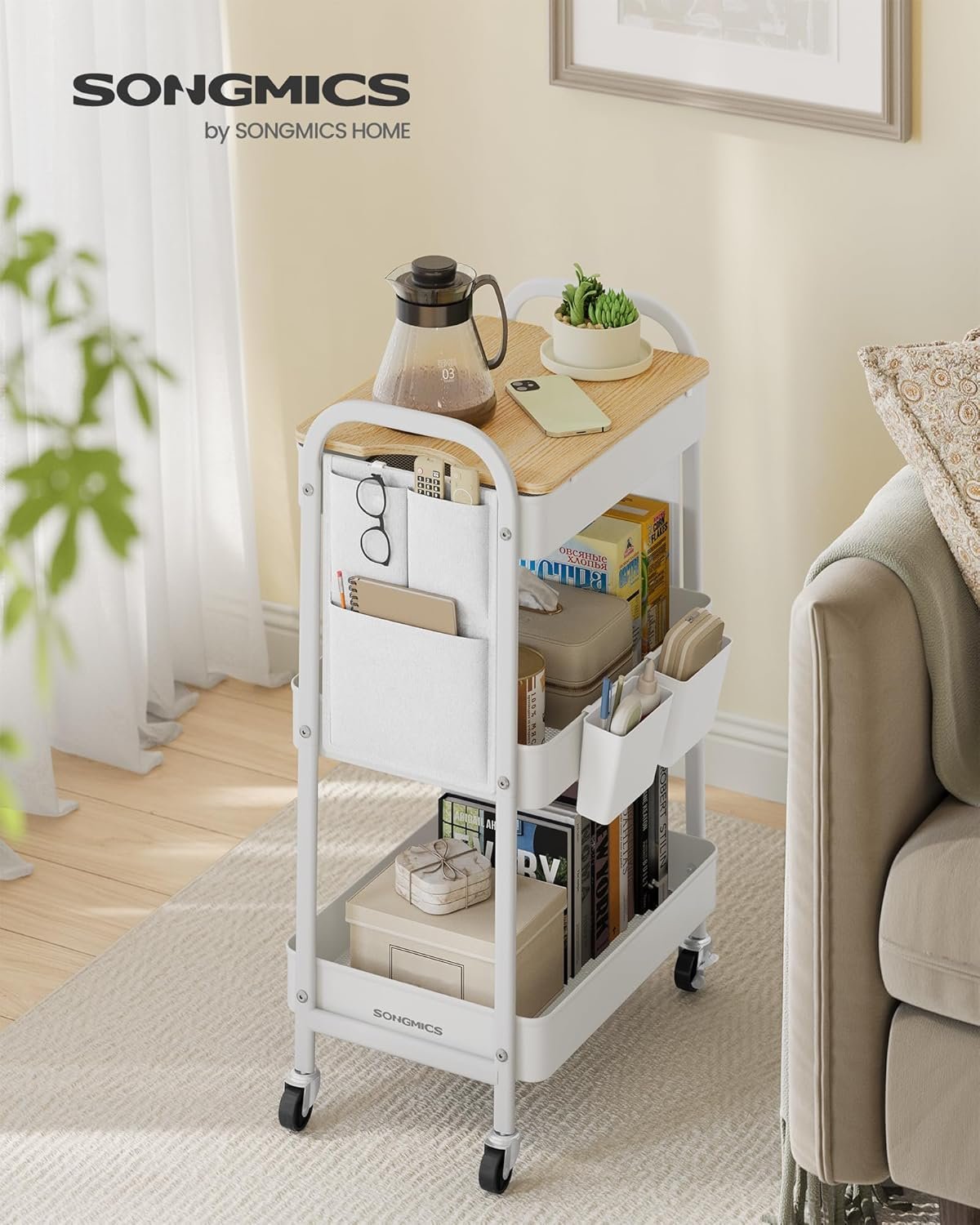 SONGMICS Raft de depozitare mobil tip carucior rulant, pentru baie sau bucatarie, cadru otel cu blat MDF, 31x44x74 cm, alb