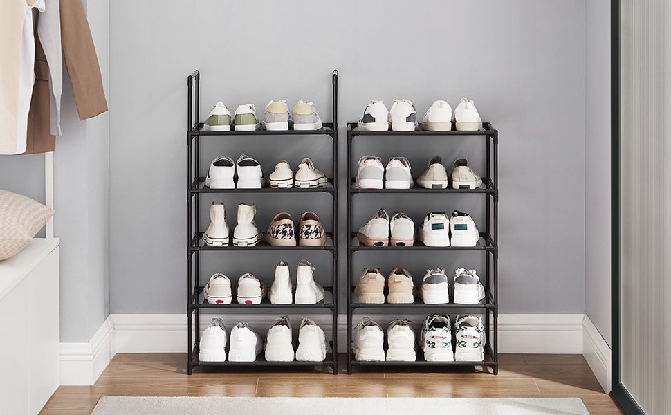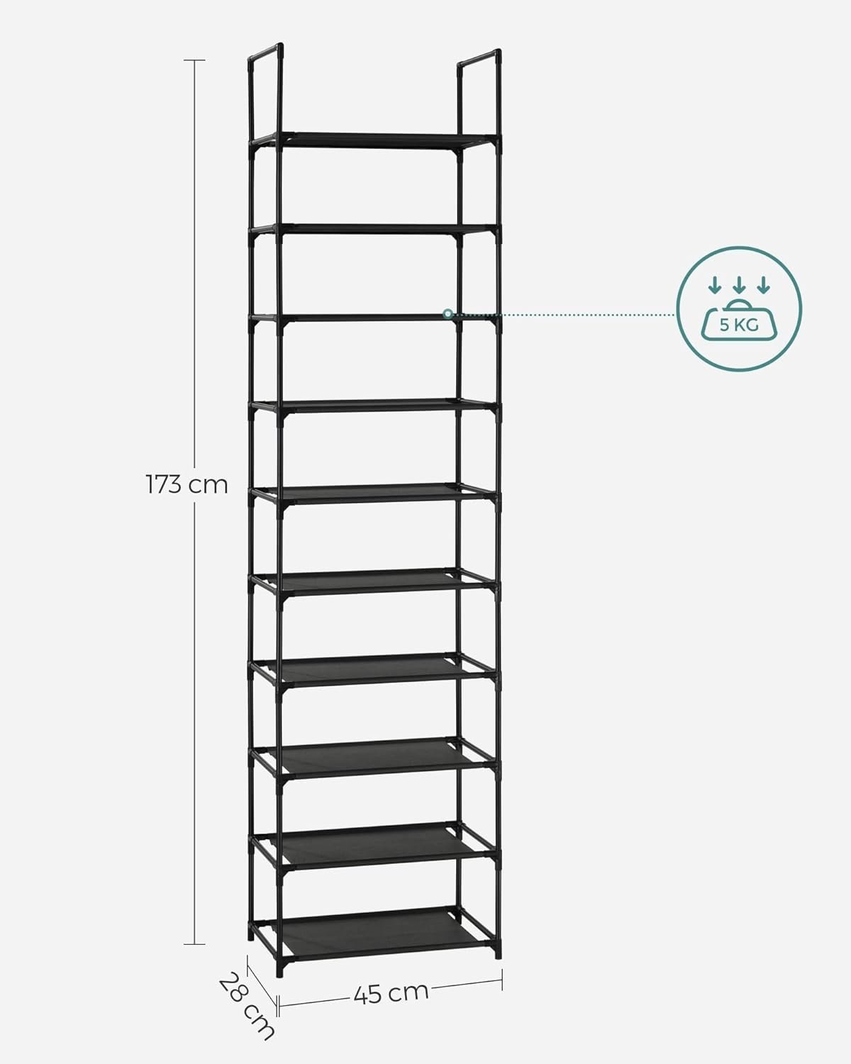 Specification: SONGMICS Raft de depozitare pantofi pe 10 niveluri, metal, instalare modulara, 28x45x173cm, negru