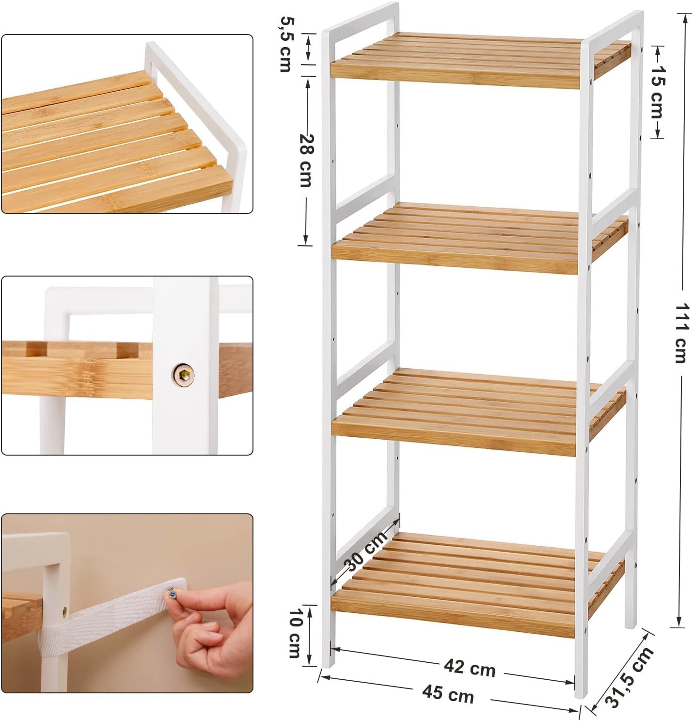 Specification: SONGMICS Raft din bambus cu 4 nivele reglabile, pentru bucatarie sau baie, 32x45x111 cm, alb si maro