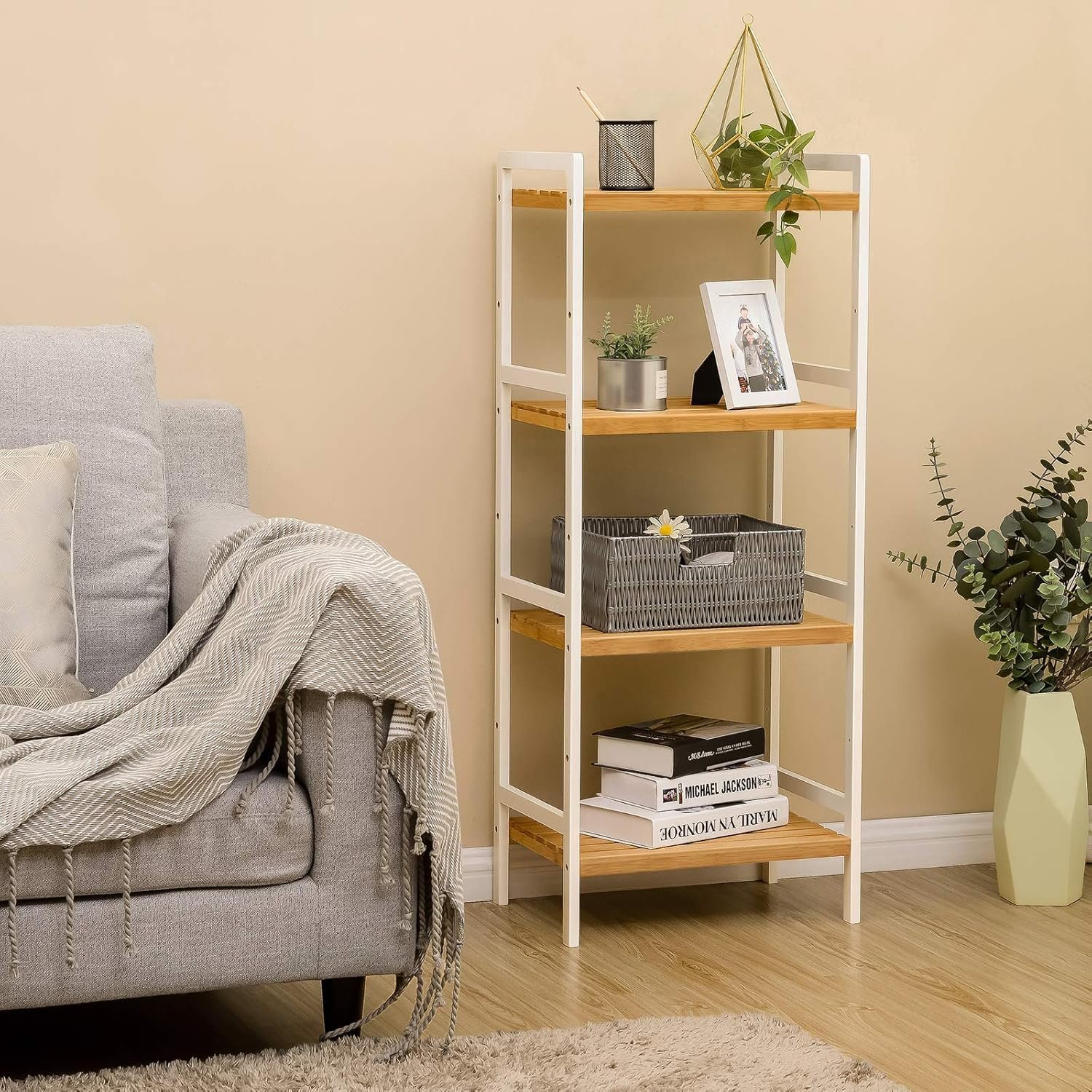 SONGMICS Raft din bambus cu 4 nivele reglabile, pentru bucatarie sau baie, 32x45x111 cm, alb si maro