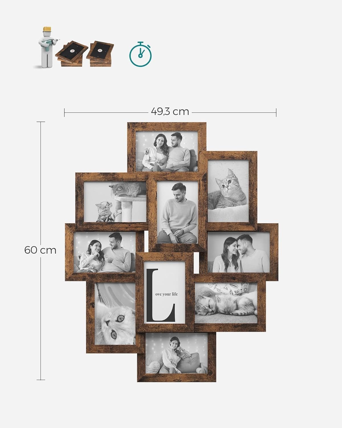 Specification: SONGMICS Rama foto de perete din MDF, colaj de 10 fotografii, 60x49cm, maro rustic
