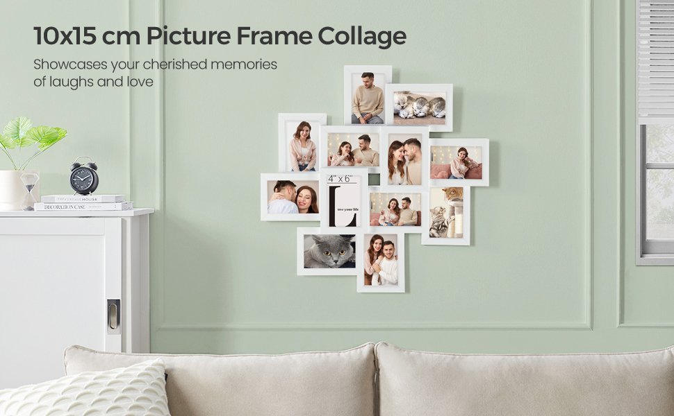 Specification: SONGMICS Rama foto de perete din MDF cu sticla, colaj de 12 fotografii, 63x63cm, alb