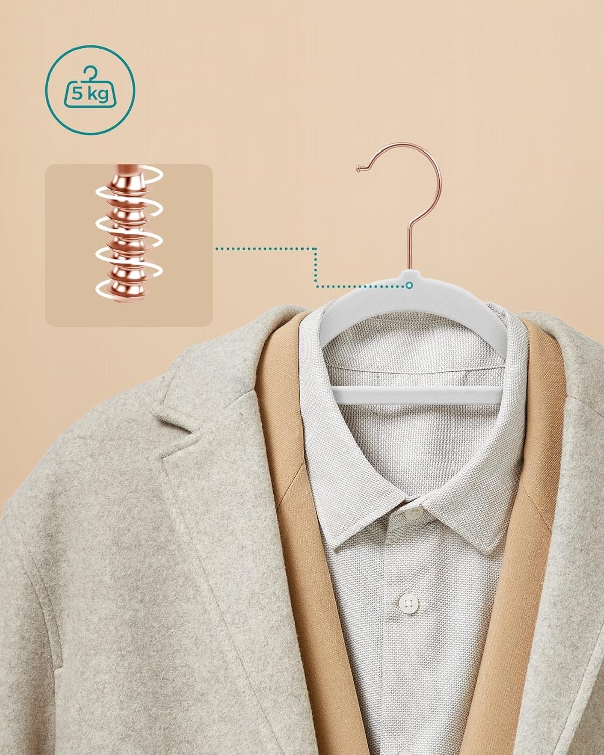 Culoare: Rose Gold + alb Material: Matase Dimensiuni produs : 45W x 0.6H cm Caracteristica speciala: Slim, antiderapant Despre acest articol Suprafata antiderapanta: Suprafata de catifea a umeraselor creste frecarea, iar canelurile antiderapante de pe umeri impiedica alunecarea hainelor – chiar si a camasilor de matase.Subtire, dar solid: Fabricate din plastic ABS durabil, aceste umerase de haine sunt subtiri, dar foarte rezistente; fiecare umeras are o capacitate de incarcare statica maxima de 5 kg, astfel incat chiar si paltoanele grele de iarna pot fi agatate fara probleme.Economie de spatiu: Fiecare cuier de catifea are un profil subtire, permitandu-va sa atarnati mai multe haine in acelasi spatiu de dulap; bara centrala poate fi folosita pentru esarfe sau cravate.Carlige din aur roz: Carligele stralucitoare din aur roz se rotesc la 360°, ajutandu-va sa va atarnati hainele in mod ordonat, adaugand in acelasi timp putina stralucire dulapului dvs.Un set de 50 de umerase de catifea de inalta calitate cu carlige stralucitoare din aur roz, rezistente si greu de rupt, si o modalitate mai buna de a va organiza garderoba.