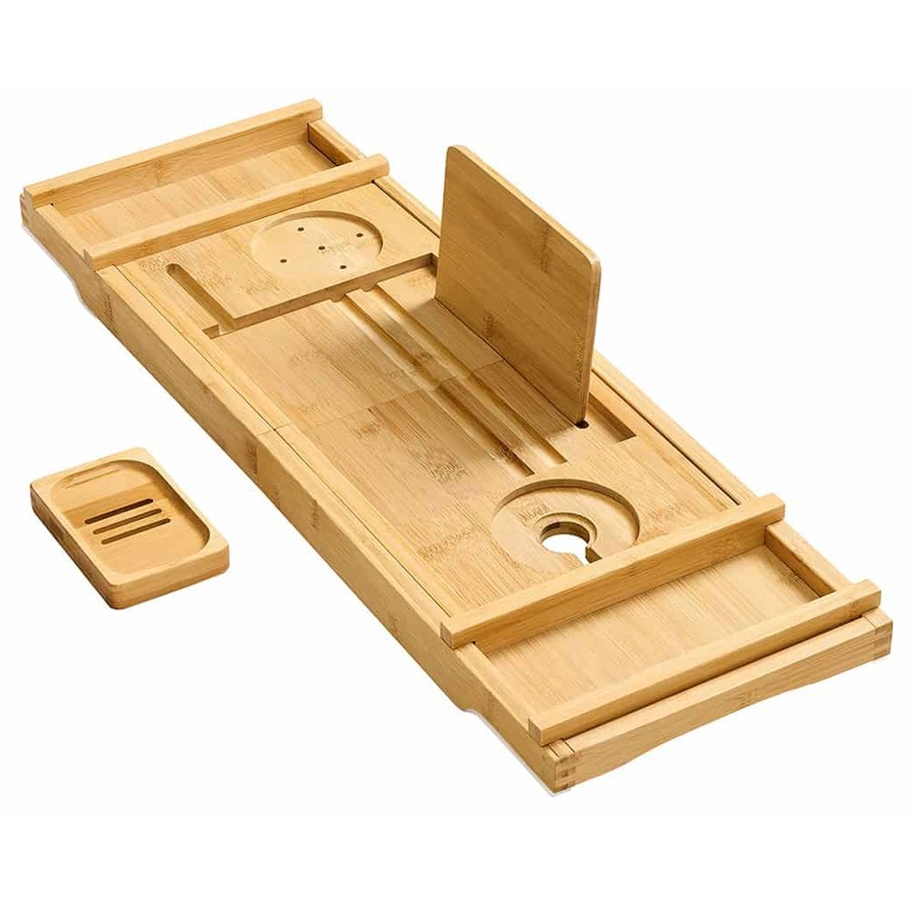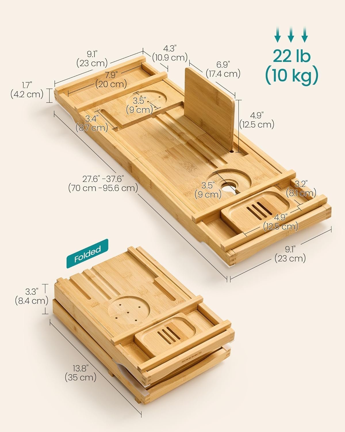 Specificatii tehnice Brand: SONGMICS Material: Bambus Culoare: Bej natur Dimensiuni extinse: 70 – 95,6 cm Dimensiuni pliat: 23 x 35 x 8,4 cm Caracteristici speciale: Extensibil, pliabil, antialunecare, multifunctional Scurta descriere Transforma-ti baia intr-o oaza de relaxare cu suportul extensibil pentru cada de la SONGMICS. Fabricat din bambus natural, acest suport inteligent se extinde pana la 95,6 cm pentru a se potrivi celor mai multe cazi. Include spatii dedicate pentru pahar de vin, tableta, telefon, carte, prosop si lumanare parfumata. Este pliabil si usor de depozitat, iar benzii antialunecare ii asigura stabilitatea in timpul folosirii. Caracteristici principale Extensibil intre 70 si 95,6 cm Pliabil pentru economisirea spatiului Suport pentru pahar, tableta, telefon, carte si prosop Bambus natural, rezistent si estetic Benzi antialunecare pentru siguranta in utilizare