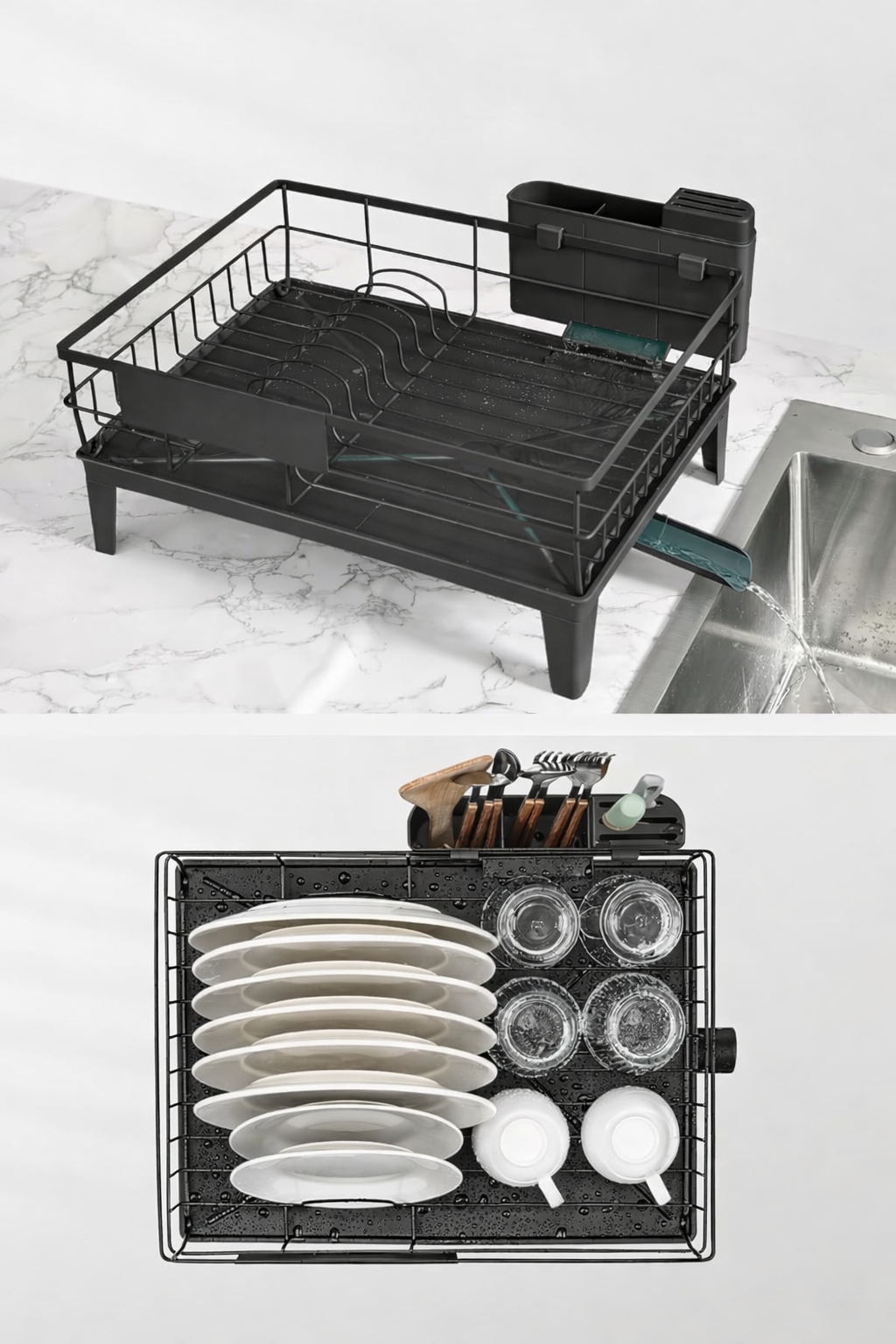 Specificatii tehnice Brand: SONGMICS Model: KCS550B01 Tip produs: suport vase pentru scurgere Culoare: negru Material: otel carbon, polipropilena (PP) Dimensiuni: 31 x 42 x 19 cm Scurta descriere Suport compact pentru vase, ideal pentru familii de 2-3 persoane. Dispune de tava de scurgere inclinata si gura de evacuare rotativa 360°, pentru directionarea apei direct in chiuveta. Caracteristici principale Sistem eficient de drenaj cu scurgere rotativa si extensibila Tava inclinata pentru evacuare rapida a apei Capacitate pentru 11 farfurii, boluri si pahare Structura din otel carbon cu strat protector anti-rugina Montaj rapid, fara unelte sau suruburi