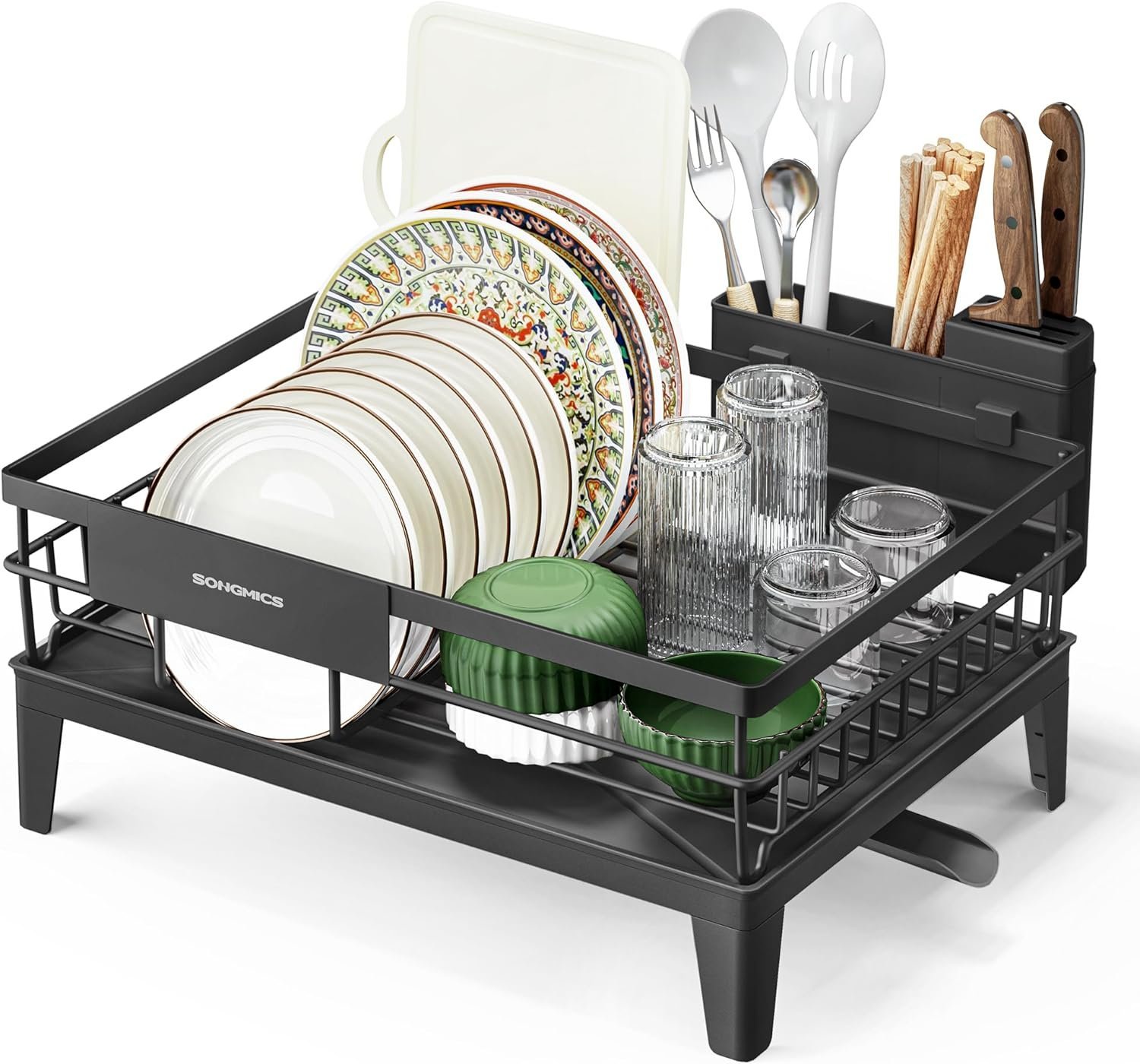 Specification: SONGMICS Suport vase metalic, cu tava si scurgere mobila direct in chiuveta, 31x42x19 cm, negru