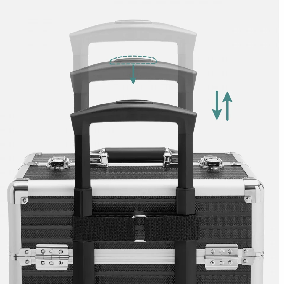 Material: metal (aluminiu), MDF, plastic ABS Interior catifelat din velur Dimensiune: 24 x 34 x 70.5 cm Inaltime maner: 32 cm Capacitatea maxima de sustinere: 27.5 kg Pachetul contine: 1x organizator 4x roti universale 4x chei Un troller de machiaj cu 4 roti si 4 chei pentru a-ti proteja obiectele personale, un companion practic pentru calatoriile de afaceri, care este o idee de cadou ideala! Pentru colectia ta in crestere de produse cosmetice : Acest troller de cosmetice mare ofera o multime de spatiu de depozitare pentru machiajele tale: compartimente multiple pentru rujuri si farduri de ochi si un compartiment mare pe partea de jos pentru haine sau uscatorul de par. Calatoreste linistit cu acest troller : Placi MDF durabile, margini din aluminiu robuste, un maner telescopic ajustabil, o suprafata din plastic ABS usor de intretinut – acest troller de machiaj este un companion practic in calatoriile tale. Cu roti sau fara? Decizia ta!: Trollerul de cosmetice este echipata cu roti universale si poate fi usor impins in locul dorit. Desigur, poti indeparta, de asemenea, rotile daca doresti si sa ill fixezi intr-un singur loc. Un cadou care vine din inima : Ofera celor dragi care calatoresc des sau mult acest troller de cosmetice – cu siguranta vor straluci de fericire.