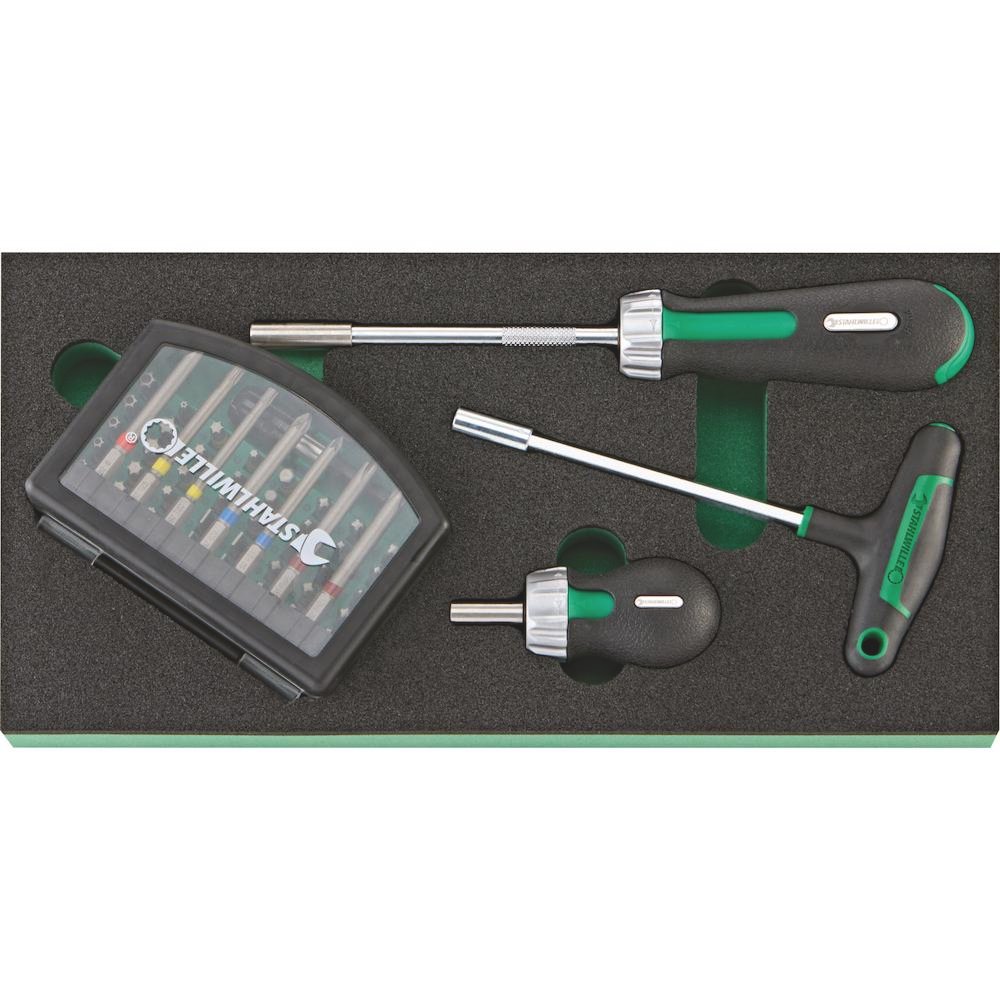 - 1 set de biți No. 1206: 1 suport pentru biți | L. 25 mm: SL4; 5; 6 mm (2x) | PH1; 2; 3 (3x) | PZ1; 2; 3 (3x) | T10; 15; 20; 25; 27; 30; 40 (2x) | T BO10; 15; 20; 25; 27; 30; 40 | INHEX 3; 4; 5 mm | L. 75 mm: SL6 mm | PH2; 3 | PZ1; 2 | T20; 25 – Set de 56 piese