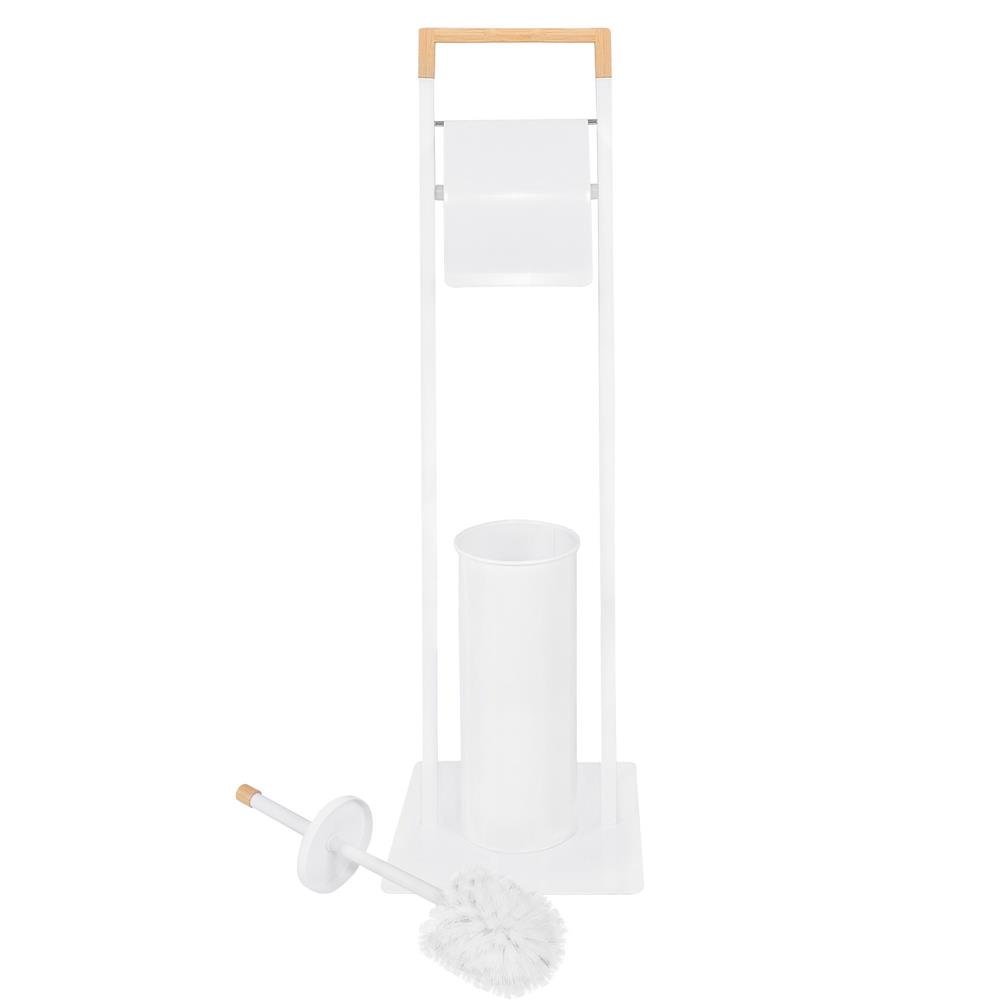 Stand cu perie WC si suport hartie igienica, metal si bambus, 74cm, alb