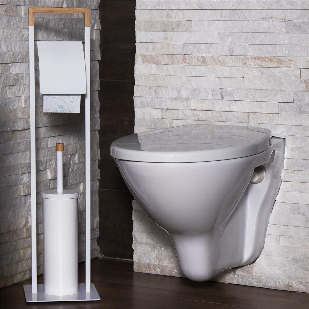 Specification: Stand cu perie WC si suport hartie igienica, metal si bambus, 74cm, alb