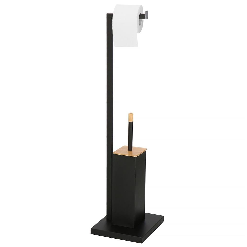 Stand cu perie WC si suport hartie igienica, metal si bambus, 79cm, negru