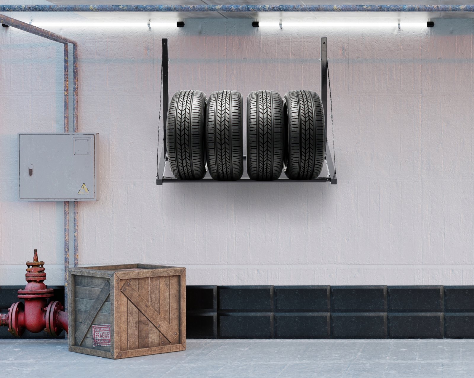 Specification: Suport suspendat pentru anvelope reglabil, montaj pe perete cu kit instalare inclus, 120x56x50 cm, negru