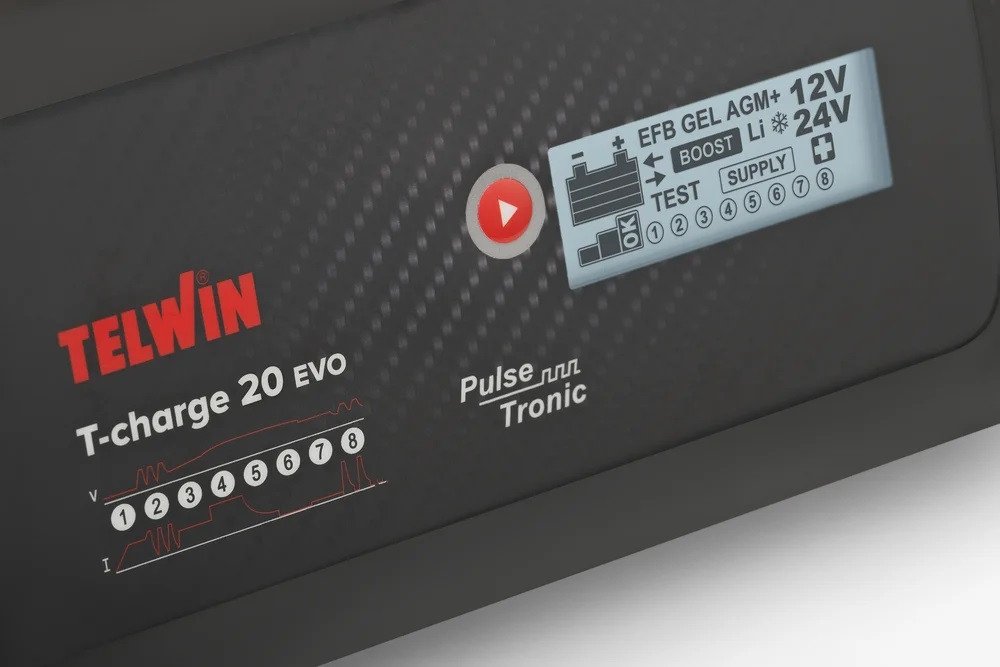 Incarcator electronic multifunctional T-CHARGE 20 EVO 12V/24V TELWIN, incarcator si tester pentru baterii WET, GEL, AGM, MF, PbCa, EFB, Li 12V / 24V cu afisaj LCD.
