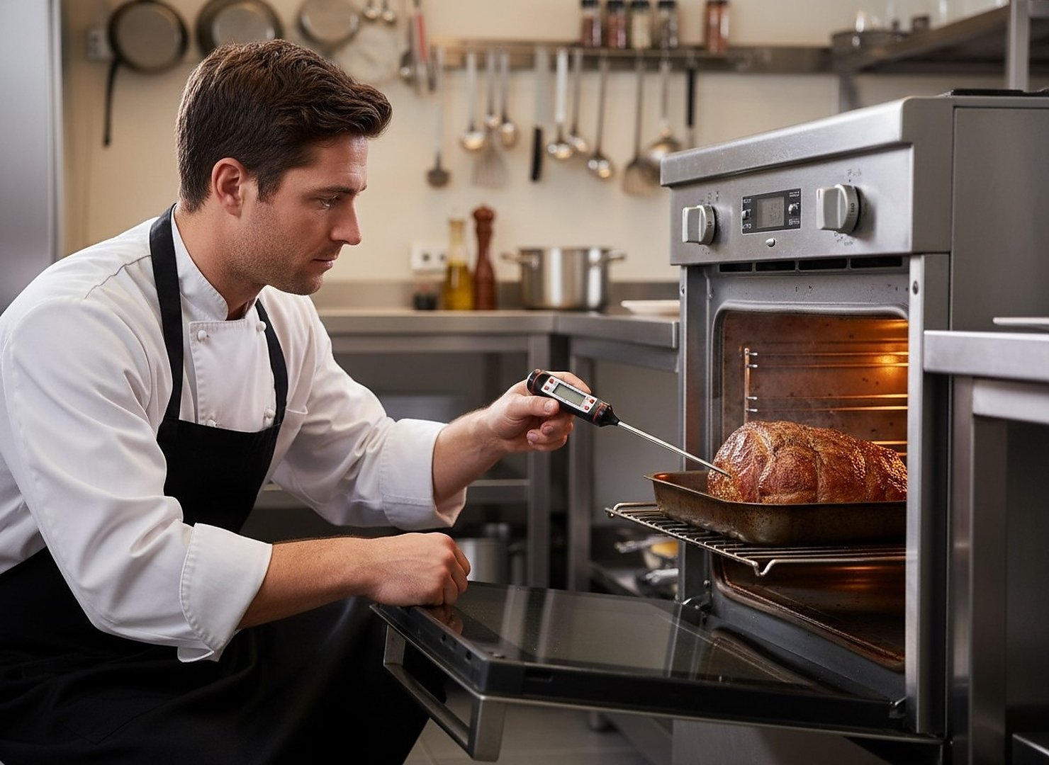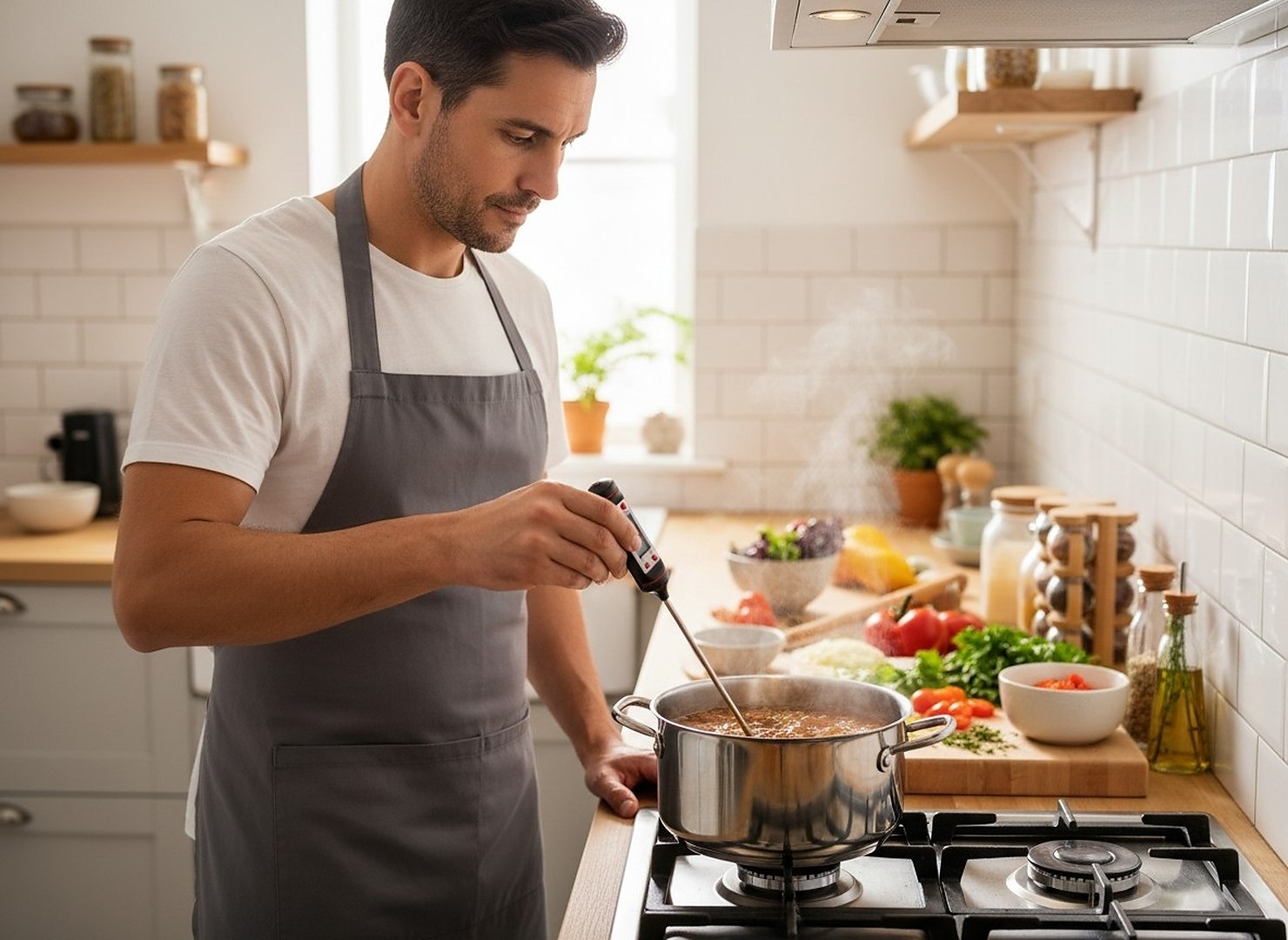 Specificatii tehnice Tip produs: termometru digital cu sonda Lungime sonda: 22 cm Afisaj: LCD digital Utilizare: bucatarie, gatit, carne, sosuri, deserturi Scurta descriere Termometrul digital de bucatarie cu sonda este un instrument practic pentru masurarea rapida si precisa a temperaturii alimentelor. Sonda lunga de aproximativ 22 cm permite verificarea temperaturii chiar si in vase adanci sau in bucati mari de carne. Afisajul LCD digital ofera citirea clara si rapida a temperaturii, fiind ideal pentru gatit, coacere sau prepararea sosurilor. Caracteristici principale Masurare rapida si precisa a temperaturii alimentelor Sonda lunga pentru utilizare in vase adanci sau bucati mari de carne Afisaj LCD pentru citire clara a temperaturii Design compact si usor de depozitat Potrivit pentru carne, deserturi, sosuri sau alte preparate Utilizare simpla in bucatarie sau la gratar Instrument practic pentru gatit precis si sigur
