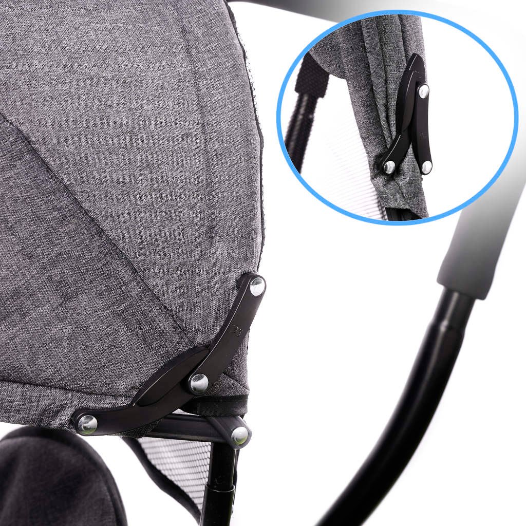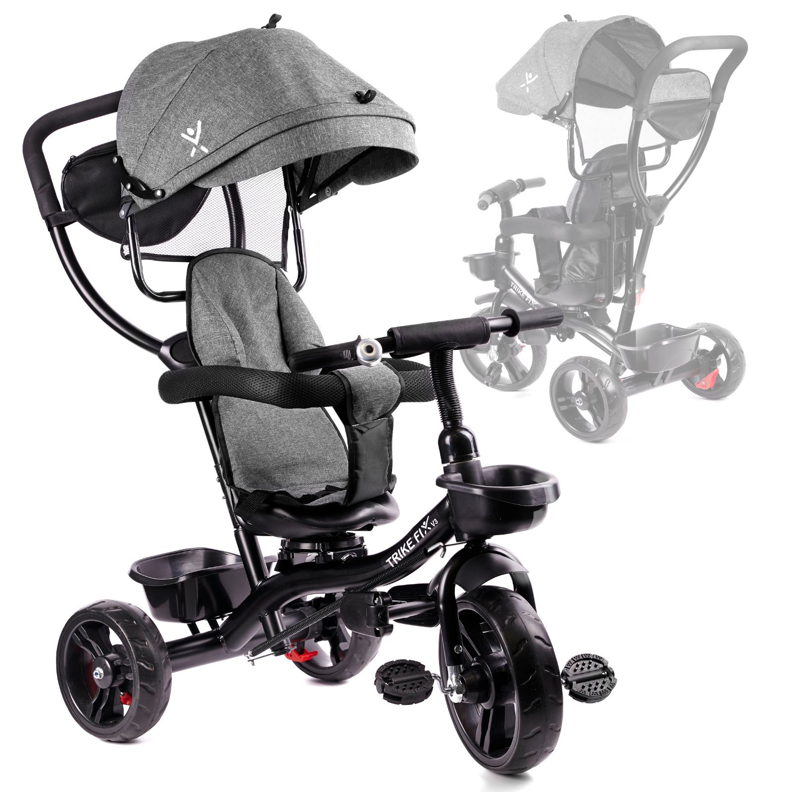 Specification: Tricicleta 3in1 105x52x94 cm, cu sezut rotativ 360°, roti fara aer, copertina reglabila, gri