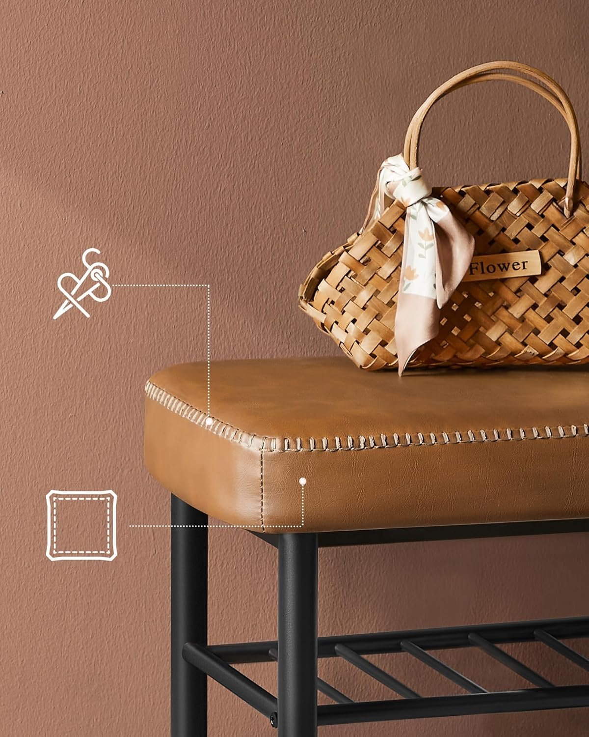 VASAGLE Banca pantofi 80x30x50 cm, cu rafturi si sezut tapitat, otel si piele PU, maro caramel