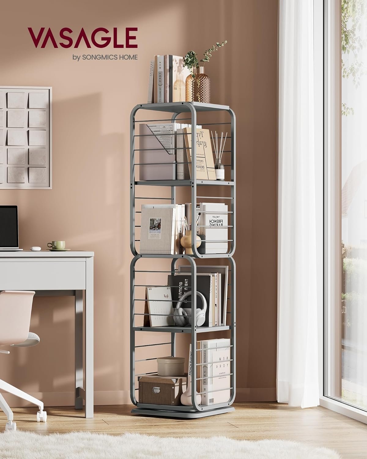 Specification: VASAGLE Biblioteca rotativa 360 grade, cadru metalic, cu 5 polite MDF, 43x43x158cm, gri