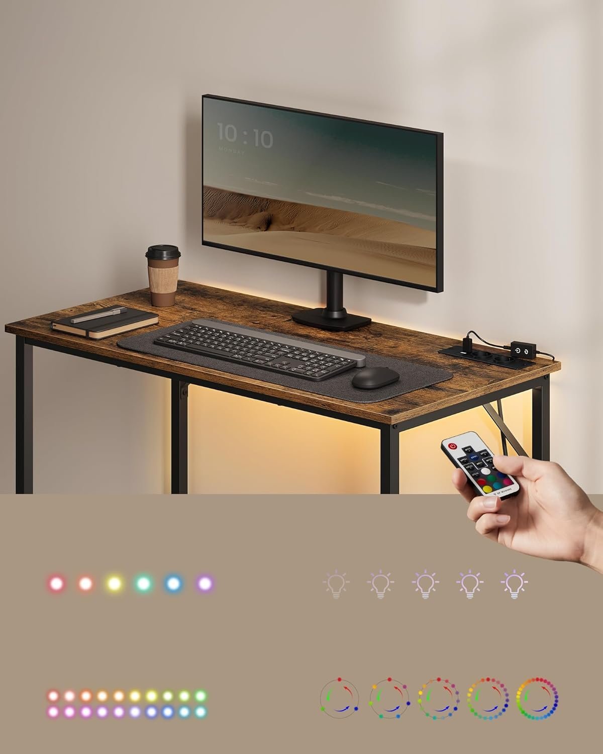 VASAGLE Birou cu iluminare LED, priza incorporata, 2 USB, 50x100x76 cm, maro rustic
